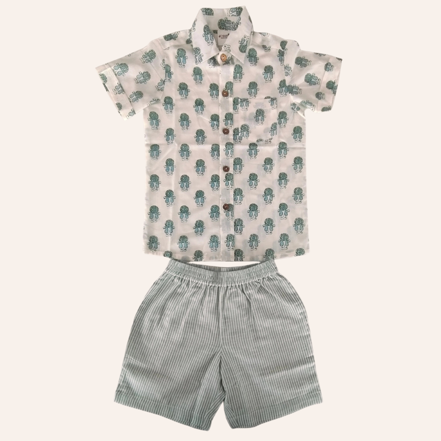 Sage Print Cotton Shirt & Stripe Shorts Set