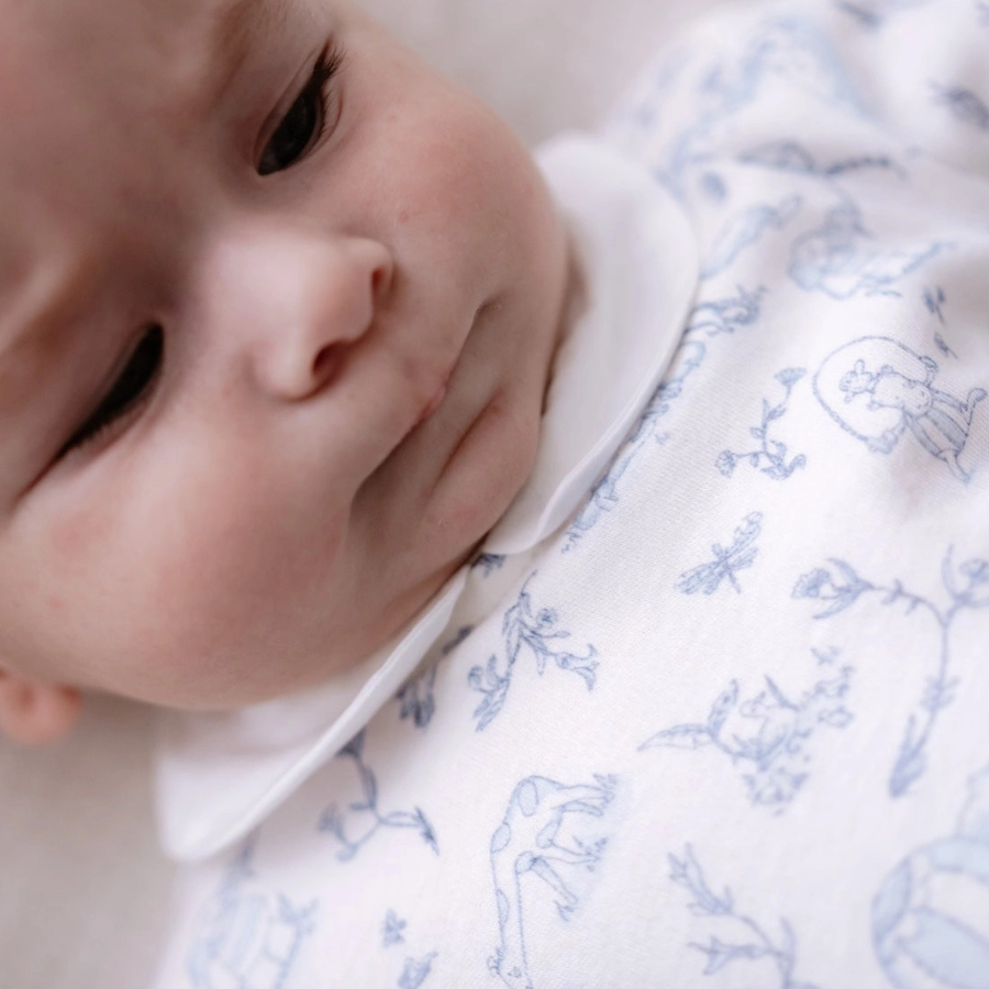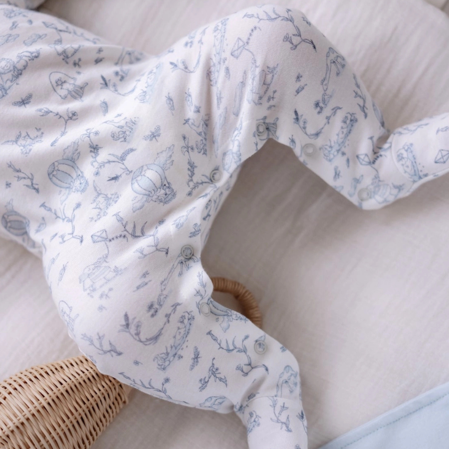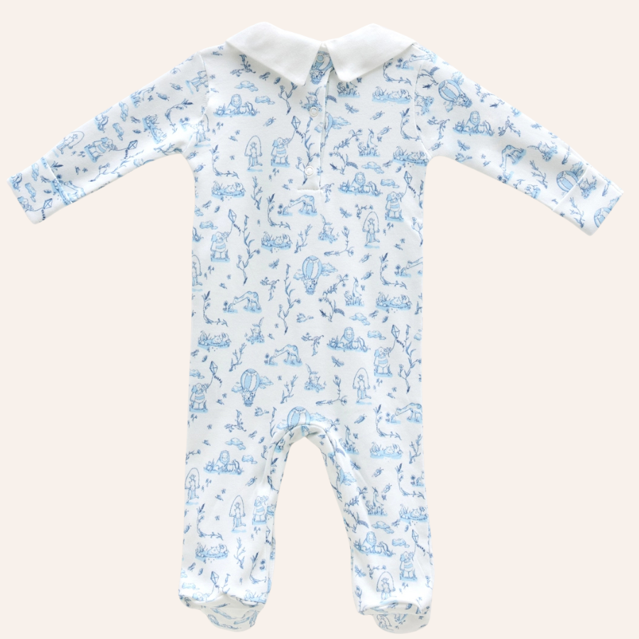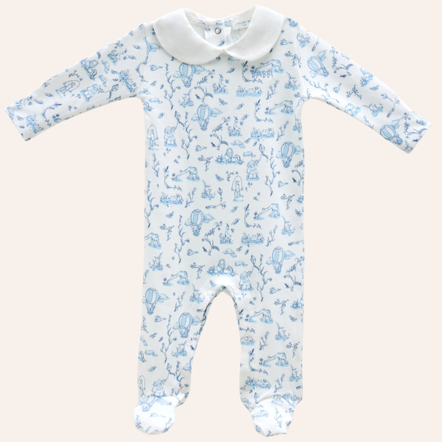 AB Blue Toile De Jouy Baby Footed Onesie