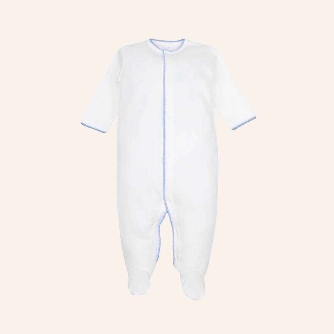 BBO White Pima Baby Footie with Baby Blue Stitching
