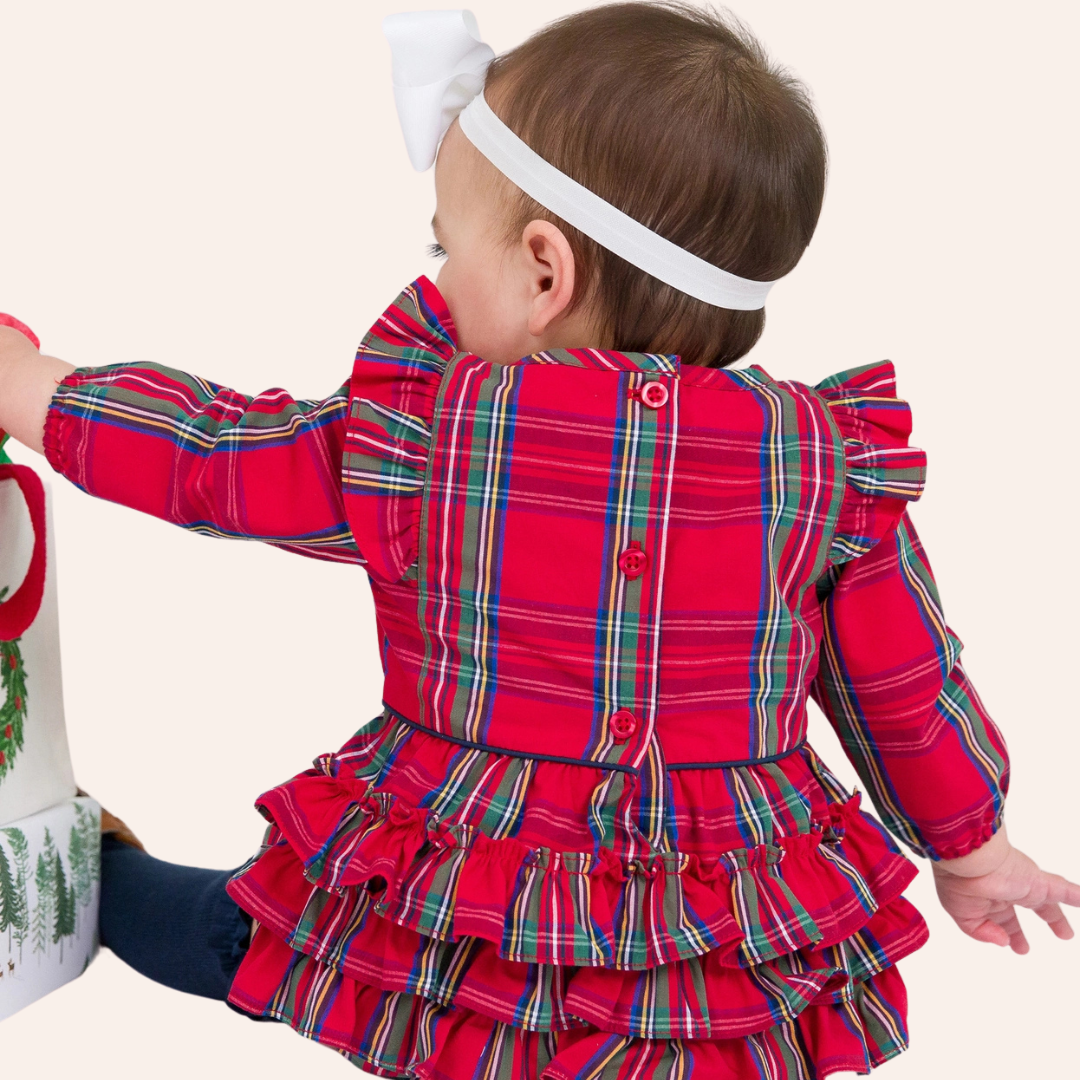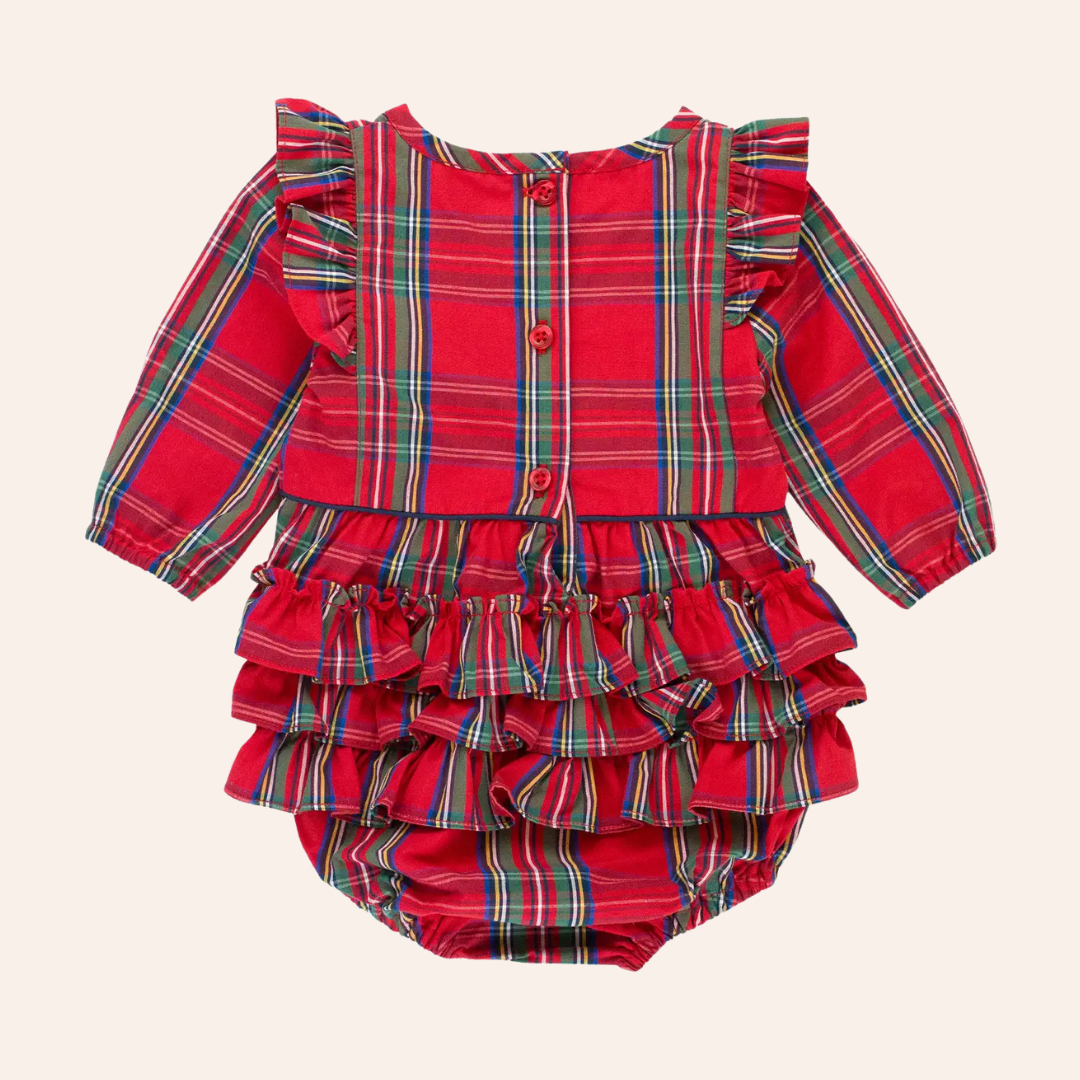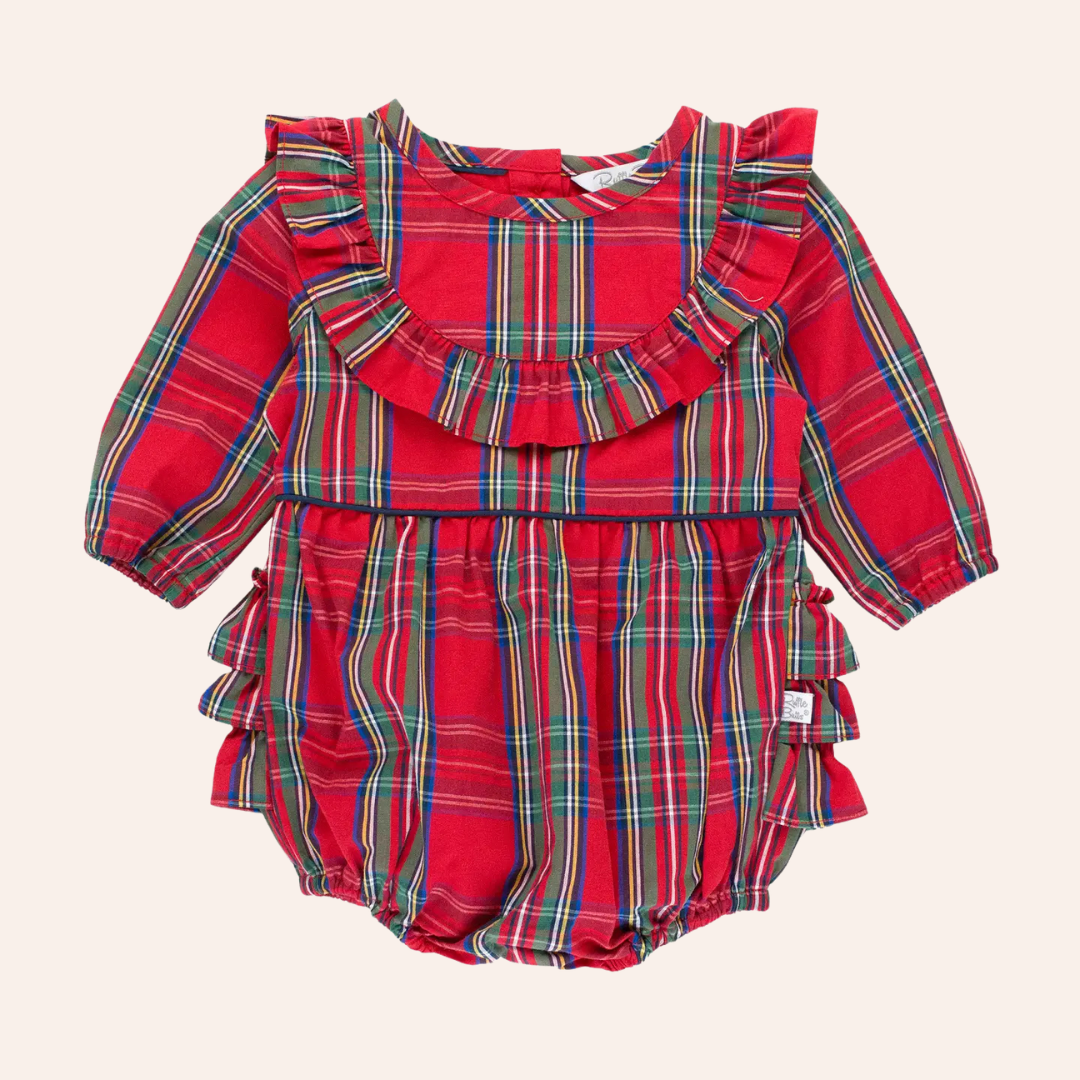 Baby Girls Tis the Season Plaid Long Sleeve Ruffle Trim Bubble Romper