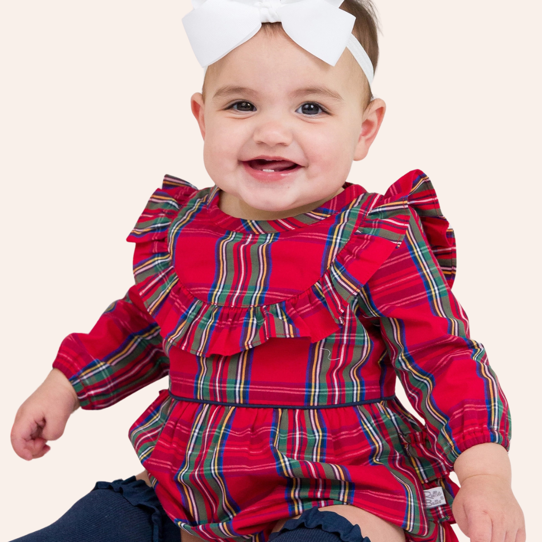 With a precious ruffle yoke detail and signature rear ruffles, this woven romper is perfect for family photos, holiday parties, or just dressing up! Buttons down the back and snaps at the legs allow for easy changing. Perfect for Christmas and staying cozy during the winter holiday season!