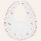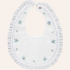 Add a touch of charm to mealtime with this delicate bib featuring floral embroidery and ruffle details. Available in white with blue or pink accents.