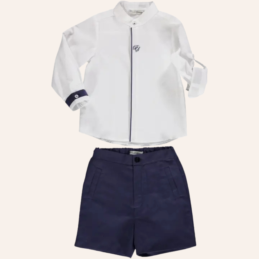 Dress your little one in timeless style with this smart 2-piece set. Includes a crisp white shirt paired with navy blue shorts, perfect for outings or special occasions. Sized for 12 to 18 months.
