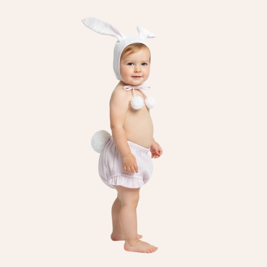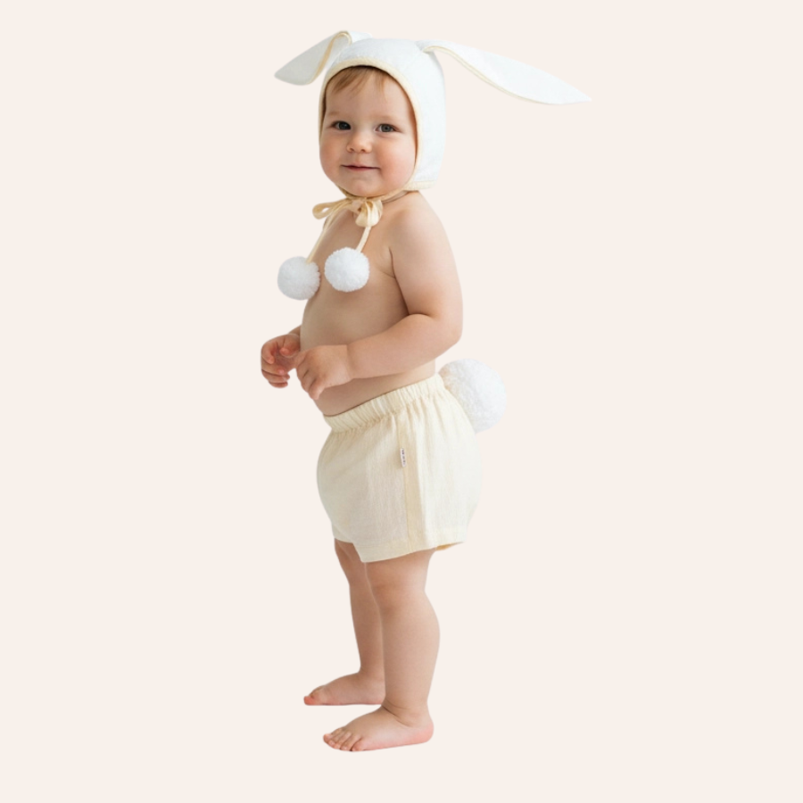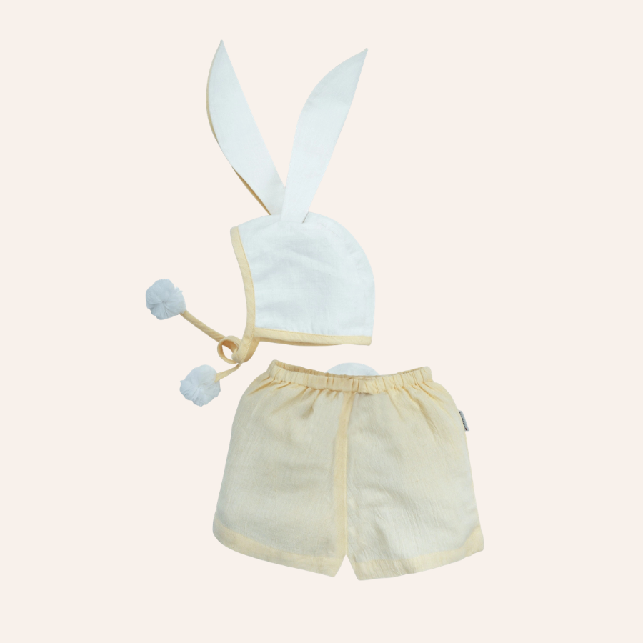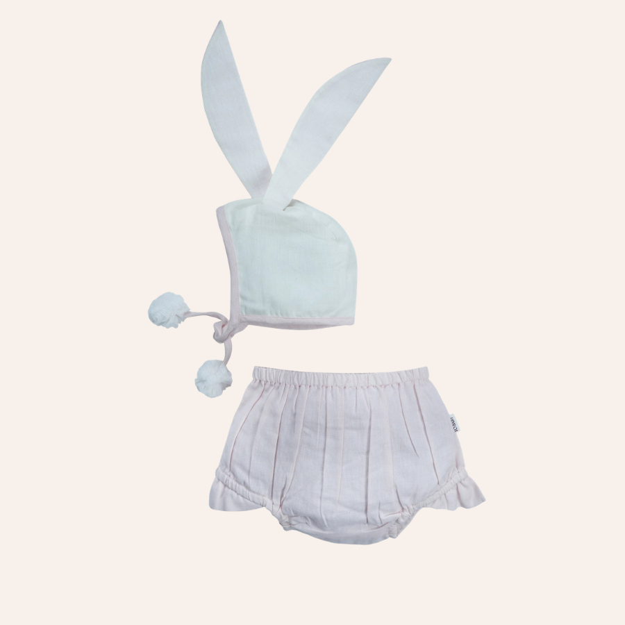 Designed with charming contrast-lined ears that coordinate perfectly with the bloomers. The removable back pom-pom offers versatility. Keep it on for a playful statement or remove it for nap time and easy restyling. Comes in pink and yellow.