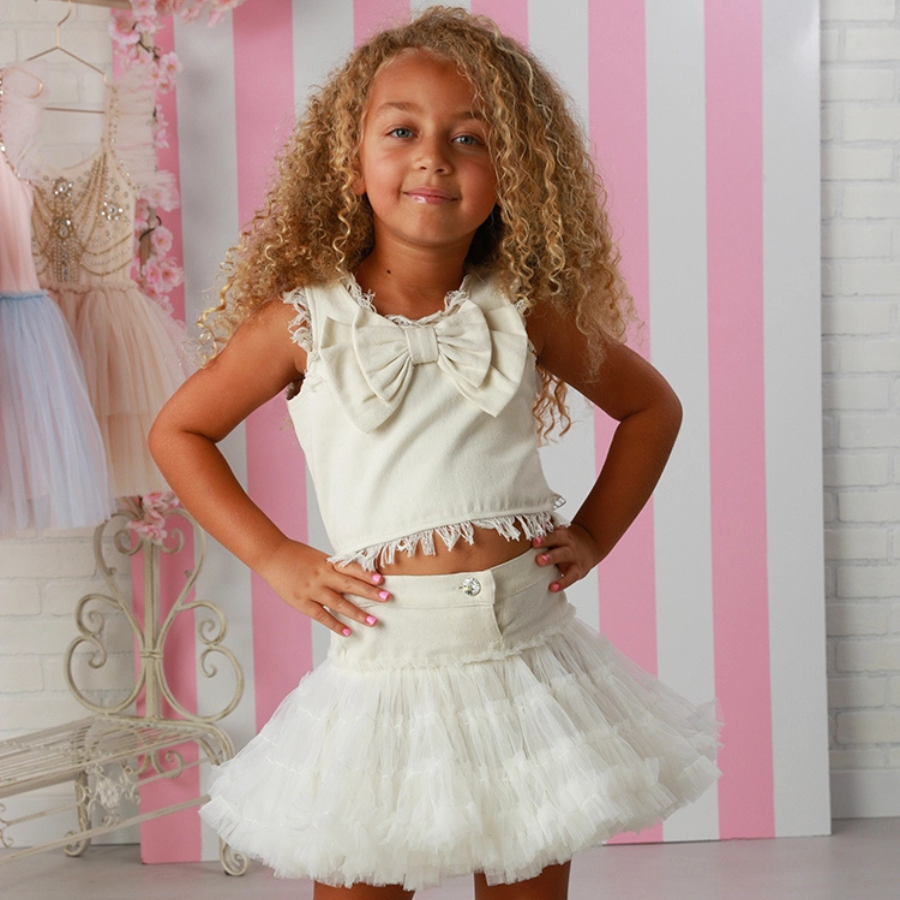 Introducing the Fifi Skirt Set by Ooh! La, La! Couture, a fusion of comfort and style for your little fashionista. This set features a white denim and tulle tutu skirt that adds a touch of whimsy to any outfit. As a brand born out of a love for fashion and inspired by children's active lifestyles, we've combined comfortable knits and exclusive prints to create this fun and funky set. Enjoy the sparkle of Swarovski crystals and fanciful trims that little divas and moms alike will appreciate. Perfect for any occasion, this set is sure to excite.
