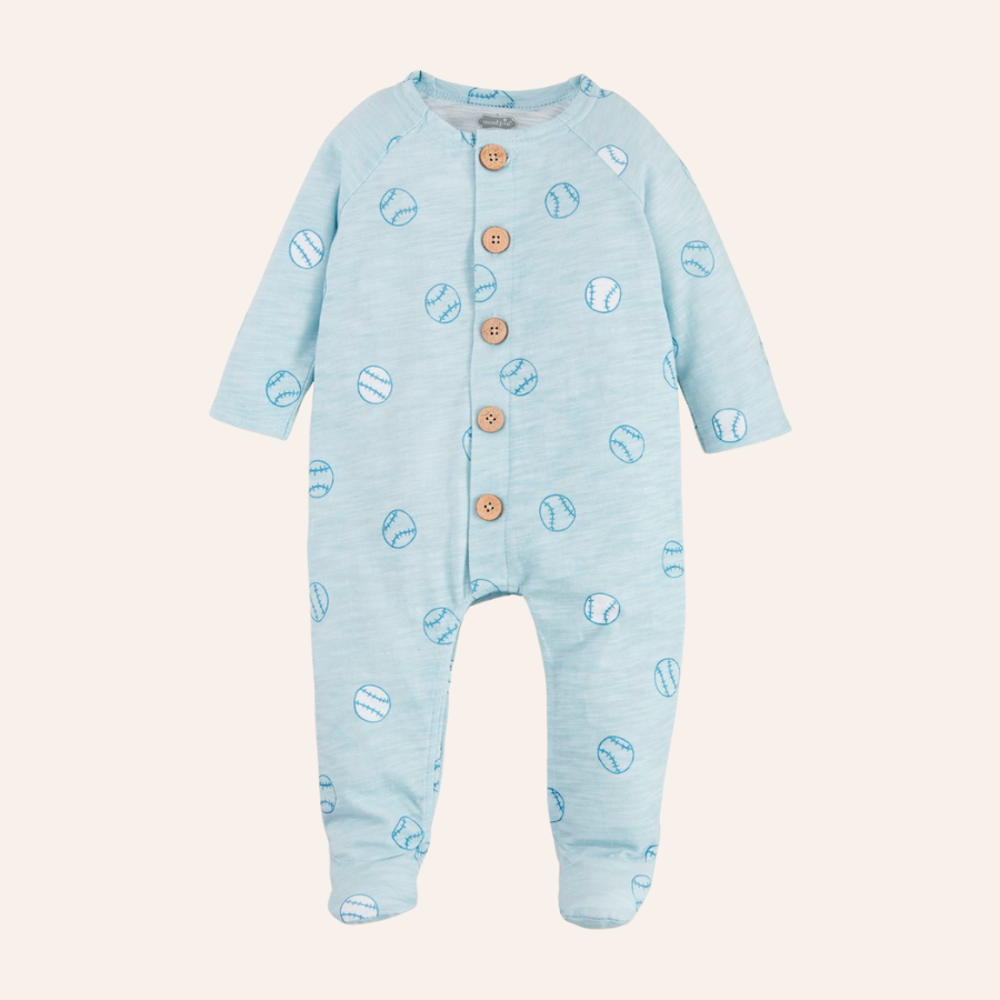 This adorable Baseball Baby Sleeper is crafted from soft, breathable cotton slub, ensuring your little one stays comfortable and cozy. The footed design keeps tiny toes warm, while the charming coconut wood button front closure adds a touch of natural elegance. Convenient inner leg snaps make diaper changes a breeze, providing practicality for busy parents. Designed for babies aged 6-9 months, this sleeper is made from 100% cotton, offering a gentle touch against delicate skin. Perfect for bedtime or lounging, this sleeper combines style and functionality for your baby's wardrobe.