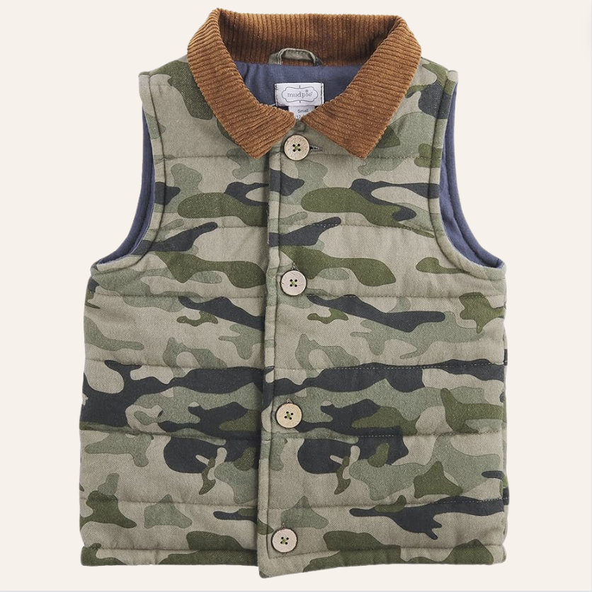 Make sure your ready for cooler weather with our baby boy's Sherpa Camo Vest. The jersey lined quilted flannel vest features caramel corduroy collar and wood button closure.