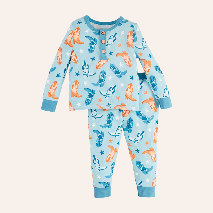 Blue Cowboy Boots Toddler Pajamas offer a delightful blend of comfort and style for your little one. This charming 2-piece set features a playful cowboy boots design, perfect for any young adventurer. Crafted from a soft and breathable knit bamboo fabric, these long pajamas ensure a cozy night's sleep. The addition of a coconut wood button chest placket adds a touch of rustic charm and easy dressing. These pajamas provide a snug fit with a hint of stretch, thanks to the 96% Viscose made from bamboo and 4% Spandex composition. Ideal for keeping your toddler comfortable and stylish all night long.