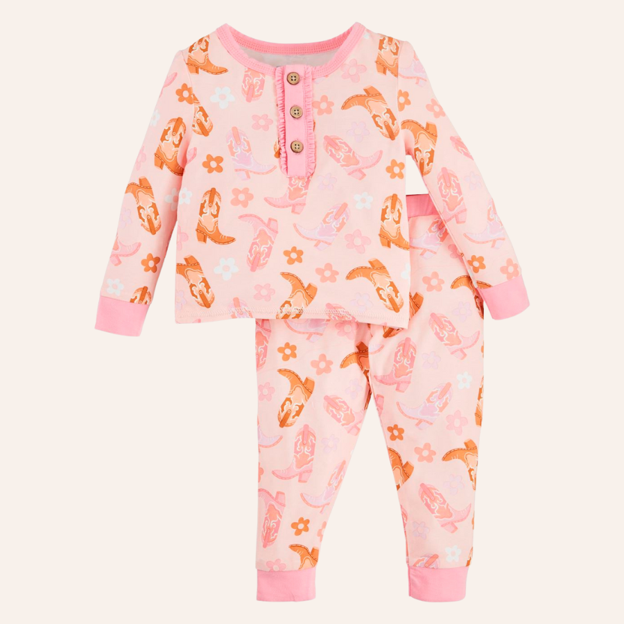 2-piece set. Knit bamboo long pajamas with coconut wood button chest placket.