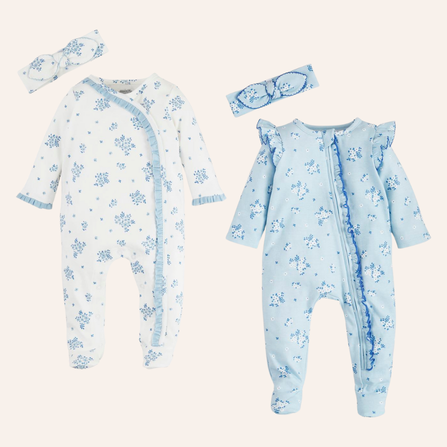 The Ditsy Floral Baby Sleeper is a charming 2-piece set designed for your little one's comfort and style. This set includes a cotton interlock ruffle footed sleeper, ensuring a cozy fit and gentle feel against delicate skin. The delightful ditsy floral pattern adds a touch of sweetness, perfect for any occasion. Accompanying the sleeper is a matching bow headband, completing the adorable look. Sized for 0-3 months, this set is crafted from 100% cotton, providing breathability and softness for your baby.
