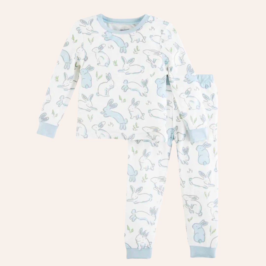 Get into the Easter spirit with our charming Blue Bunny Toddler Pajamas! This set includes two pieces that are ideal for your little one's Easter festivities. Made from soft knit bamboo, these long pajamas ensure optimal comfort for a peaceful night's sleep after all the excitement of hunting for eggs. The cute blue and white bunny pattern adds an extra touch of Easter charm to your child's bedtime attire. Please note that these pajamas fit snugly for your child's safety. Dress your little bunny in these Easter-themed pajamas and keep the festive joy going all night long!