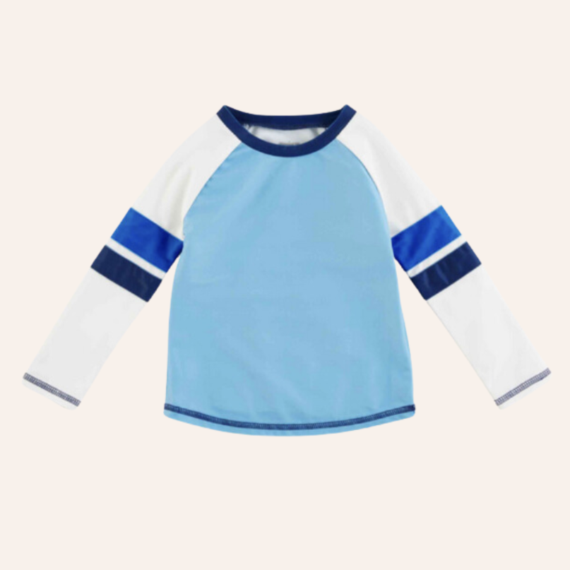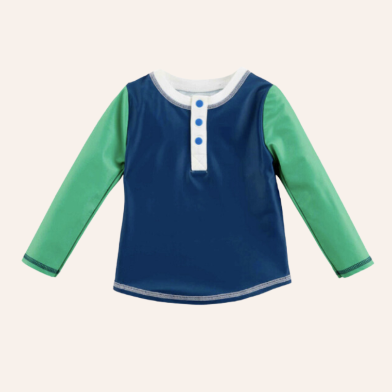 Make sure your little one is protected during their summertime fun with our Boy's Navy Rash Guard. The nylon spandex rash guard is perfect for covering little one's arms during pool and beach days. The rash guard features green, navy and white coloring making it easy to match with your favorite Mud Pie swimsuit.