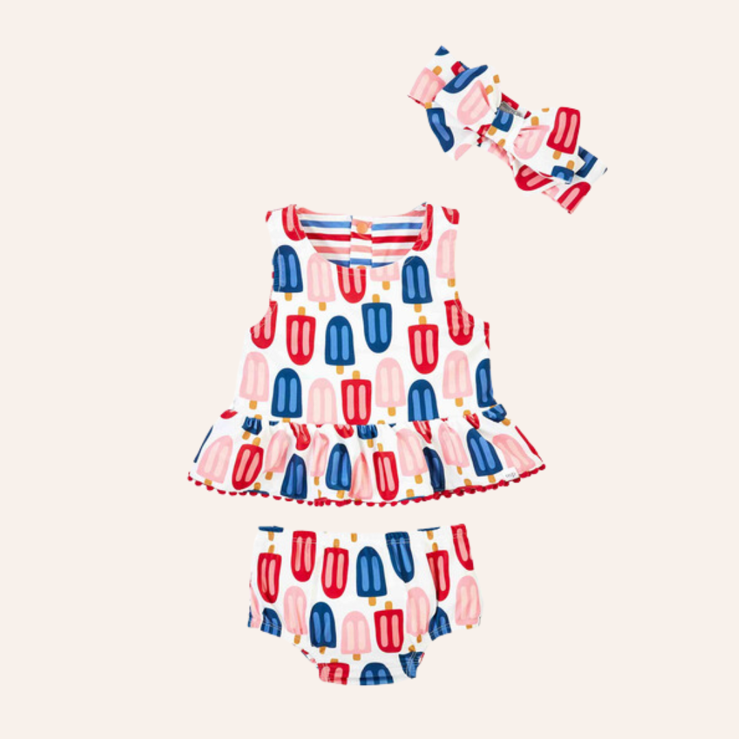 Enjoy a day in the sun with our Girls' Popsicle and Stripe Swimsuit Set. The three-piece set comes with a reversible nylon spandex two-piece swimsuit. The swimsuit features pom trimmed peplum flounce. The swimsuit comes with a bow headband. The swimsuit reverses from popsicles to stripes.