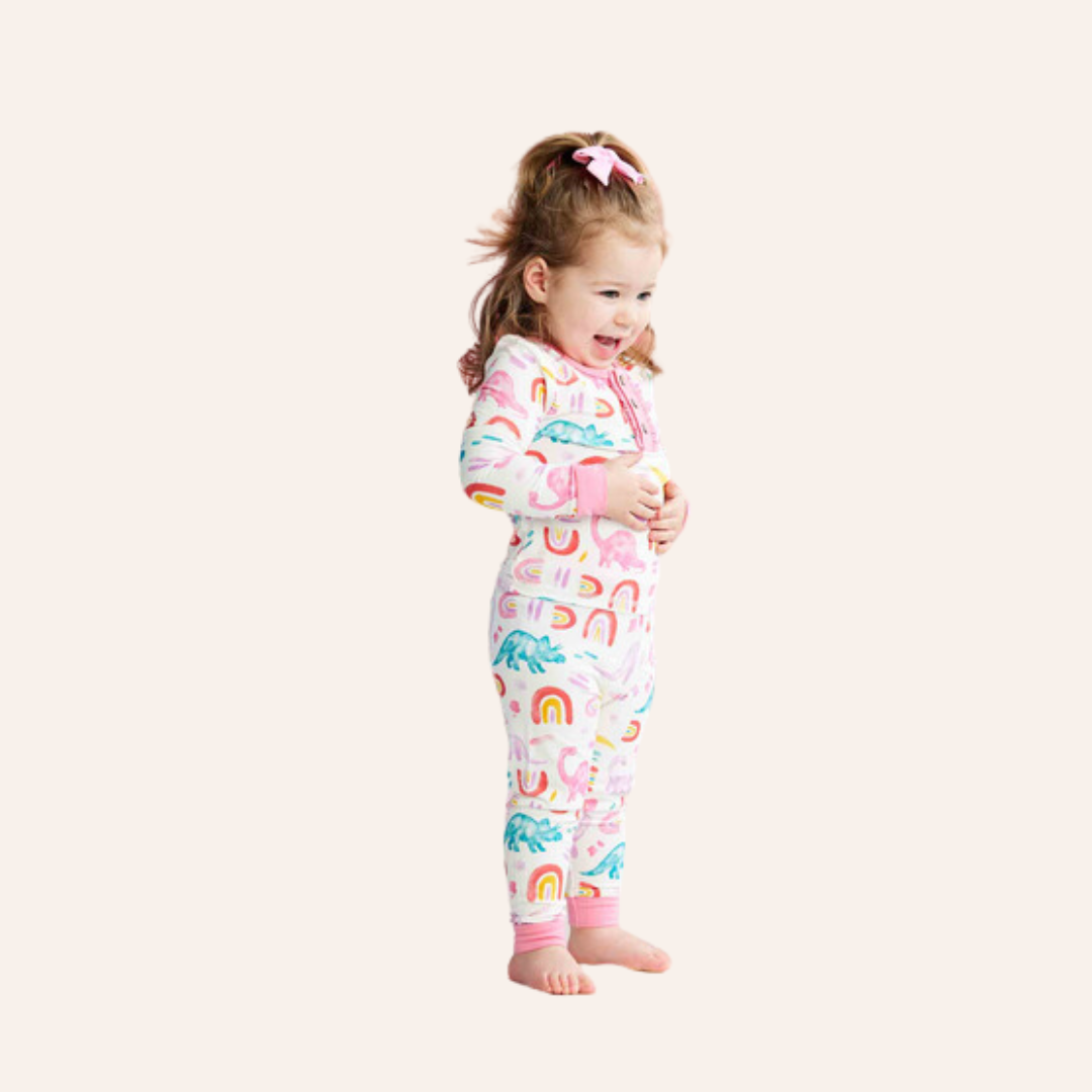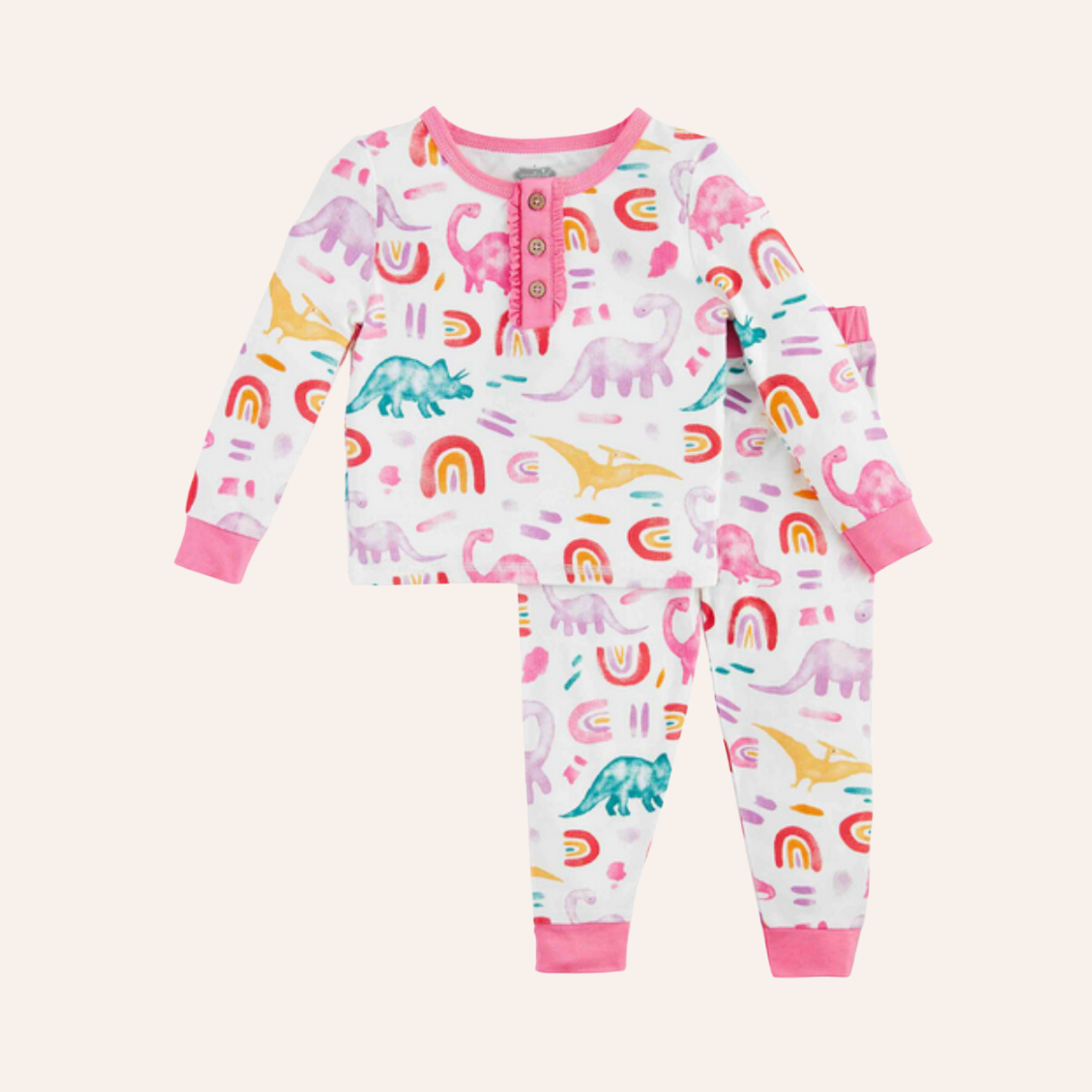 Our Girls' Dino Pajamas are designed to bring a roar of excitement to your little one's bedtime routine! This two-piece set includes a cozy long sleeve pajama top that ensures warmth and comfort throughout the night. With its charming coconut wood button ruffle placket, these pajamas add a touch of playful style to your child's sleepwear collection. Crafted from our exceptionally soft knit bamboo fabric, these pajamas provide a gentle and soothing feel against the skin. The set also includes coordinating pull-on pants for a complete and adorable look. For children who are in-between sizes, we recommend sizing up to ensure a perfect fit. Safety is our priority, and these pajamas comply with all CPSC child safety regulations, offering a snug fit for added peace of mind. Made with a blend of 96% Viscose derived from Bamboo and 4% Spandex, these pajamas offer a perfect balance of comfort and flexibility. When it's time to clean, simply turn them inside out and machine wash on cold with like colors. For drying, tumble dry on low, and they'll be ready for your child's next cozy adventure.