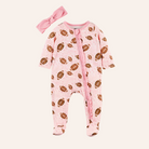 Our Pink Football Baby Sleeper is designed to enhance your little one's first football season. This adorable two-piece set includes a comfortable footed sleeper crafted from a soft waffle weave fabric. The sleeper showcases a stylish ruffle cross body zipper, while the accompanying bow headband adds an extra touch of cuteness. For optimal fit, we recommend sizing up if your child is in-between sizes, as snug-fitting pajamas are compliant with CPSC child safety regulations. Made with a blend of 59% Cotton, 39% Polyester, and 2% Spandex, this sleeper offers both comfort and durability. To keep it fresh and clean, simply turn it inside out and machine wash on cold with like colors. For drying, tumble dry on low heat.