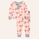 Get ready for cozy and adorable moments with our Pink Football Toddler Pajamas. This two-piece set includes a long sleeve pajama top that's perfect for snuggles. Crafted from soft and breathable knit bamboo, these pajamas ensure a comfortable sleep for your little one. The coconut wood button ruffle placket adds a charming touch to the pajama top. Accompanied by coordinating pull-on pants, this set is both stylish and practical. For optimal fit, we recommend sizing up if your child is between sizes, as snug-fitting pajamas are recommended by CPSC child safety regulations. Our pajamas are made from a blend of 94% Viscose derived from bamboo and 6% Spandex. To keep them fresh and clean, simply turn them inside out and machine wash on cold with like colors. For drying, tumble dry on low heat.