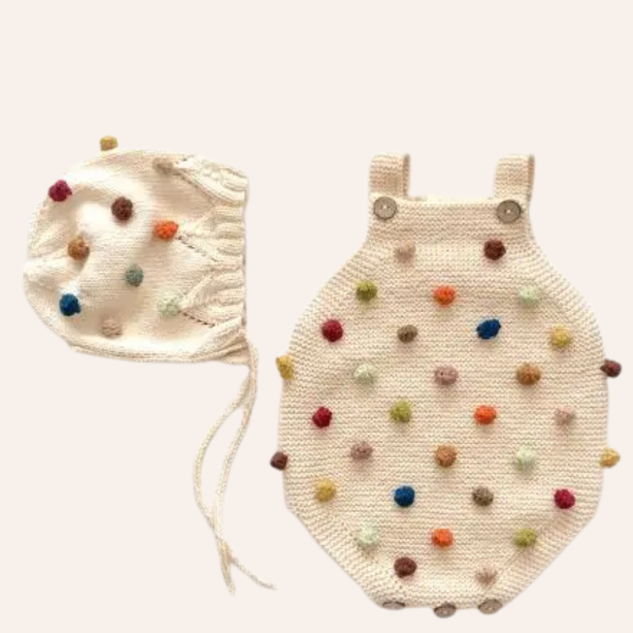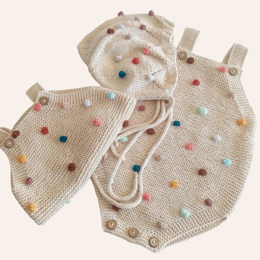 • Unique hand-knitted Popcorn Romper is designed with cute popcorns scattered all over. Makes it cute and original