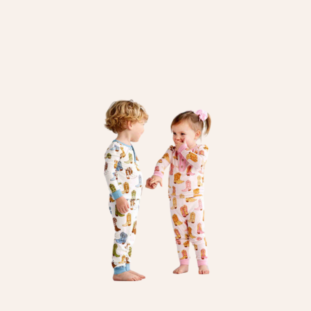Say howdy to our adorable Pink Cowboy Boots Toddler Pajamas. This two-piece set includes a cozy long sleeve pajama top designed for optimal comfort. Crafted from soft and breathable knit bamboo fabric, these pajamas provide a soothing touch against your child's skin. With a stylish coconut wood button ruffle placket, these pajamas offer a touch of rustic charm. The coordinating pull-on pants complete the ensemble, ensuring a snug and adorable fit. For children who fall in-between sizes, we recommend sizing up for the perfect fit. Our pajamas adhere to all CPSC child safety regulations, guaranteeing a secure fit. Made from a blend of 96% Viscose derived from bamboo and 4% Spandex, these pajamas offer durability and flexibility. To keep them fresh and clean, simply turn them inside out and machine wash on a cold cycle with similar colors. For drying, tumble dry on low and let your little one dream away in ultimate comfort.