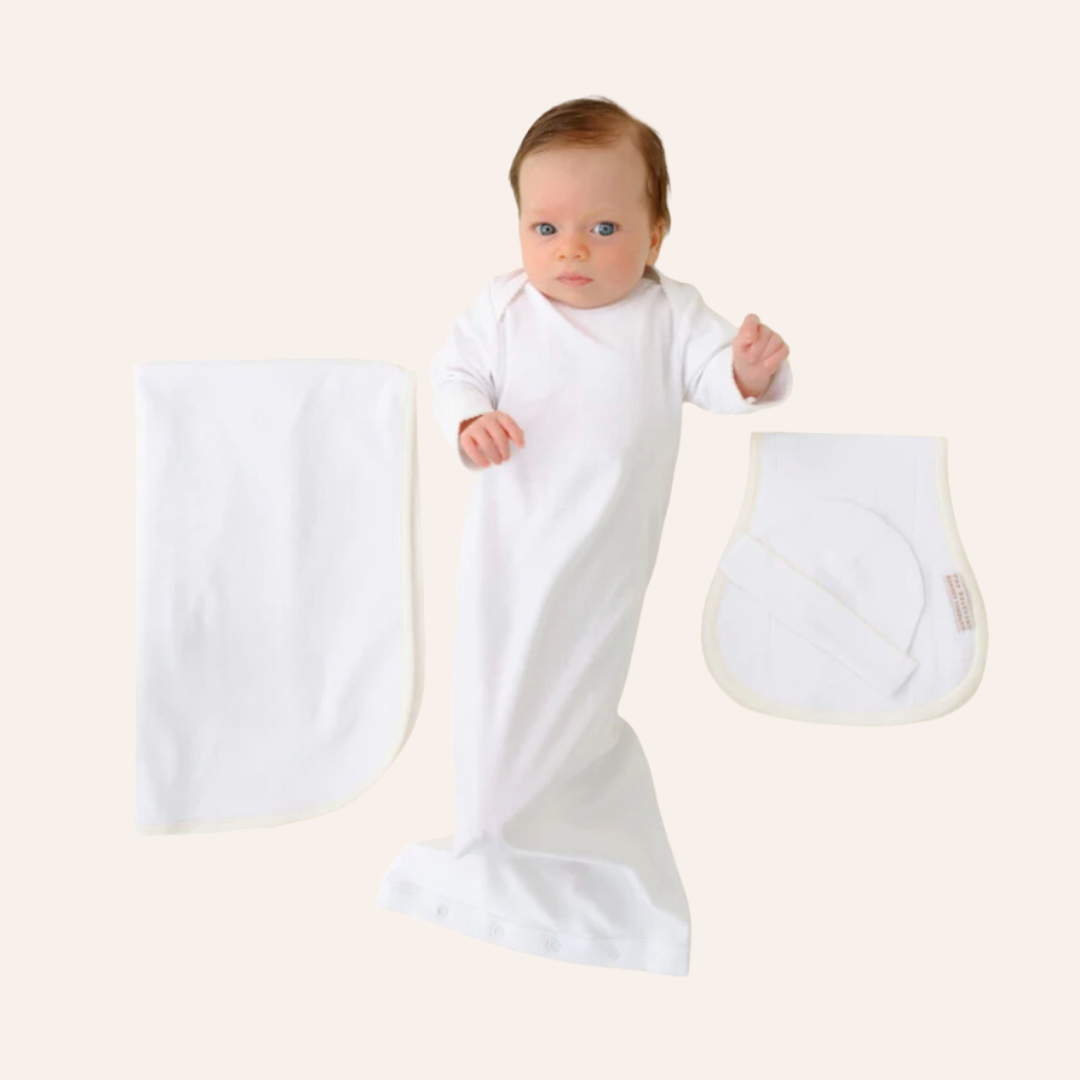 The Darling Debut Gift set includes The Oopsie Daisy Burp Cloth, Baby Buggy Blanket, gown, and hat.  Every baby should look darling when making their big debut.  First impressions count!  We pinky promise baby will love this set as much as you- it's pure Peruvian Pima Cotton perfection. MWAH!