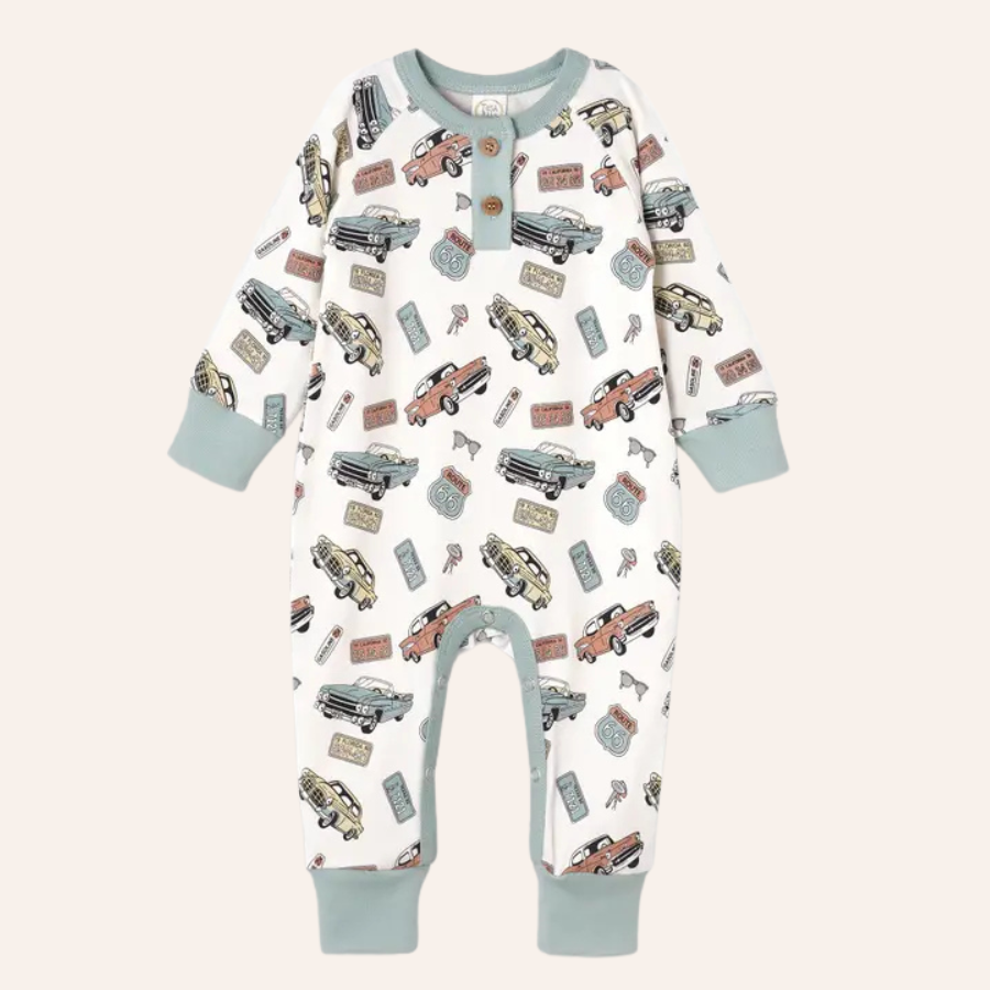 Vintage Car Henley Romper – Bamboo Baby Road Trip Style