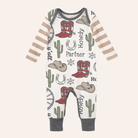 Saddle up your little wrangler in this ultra-soft cowboy-themed baby romper. Featuring an allover Western print with boots, cacti, and sheriff stars, this playful piece is finished with tan striped sleeves and heather charcoal trim for extra style. Made from 100% cotton rib, it's breathable, absorbent, and gentle on sensitive skin—perfect for everyday comfort. The envelope neckline and bottom snaps make dressing and changing quick and easy. A standout piece for little cowboys with big charm.