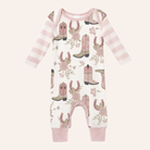 Round up the cuteness with this western cowgirl baby romper! Featuring a delightful boots-and-horseshoe print and trimmed with soft pink stripes, it's made for mini adventurers with big charm. This romper is crafted from 100% cotton rib—gentle on delicate skin, naturally hypoallergenic, and breathable to keep baby comfy from nap time to playtime. Designed with parents in mind, it includes an envelope neckline and handy snap closures for hassle-free changes. A stylish, comfy piece that brings southern flair to baby’s everyday wardrobe.