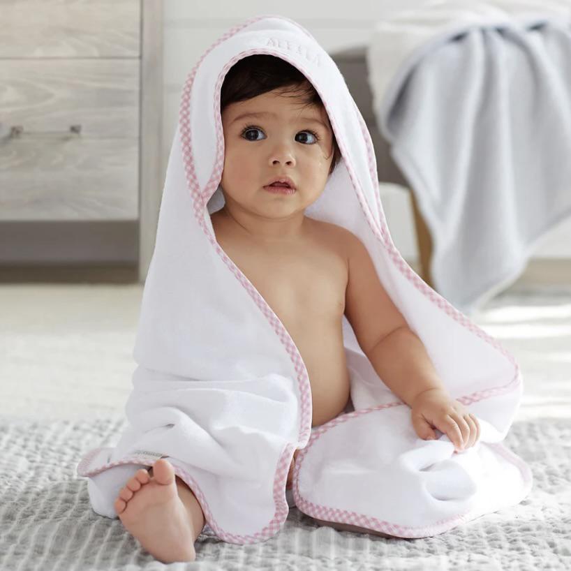 Our hooded towel set is made of extra soft, pure cotton terry for newborn’s sensitive skin. The towel is so large that it can last well into the toddler years. The hood is covered with a pique layer, which helps to hold a monogram beautifully and is backed with terry cloth for extra absorbency.