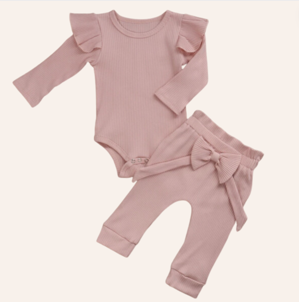 Baby Ribbed Ruffle Long Sleeve Bodysuit and Pants Set in Dusty Rose