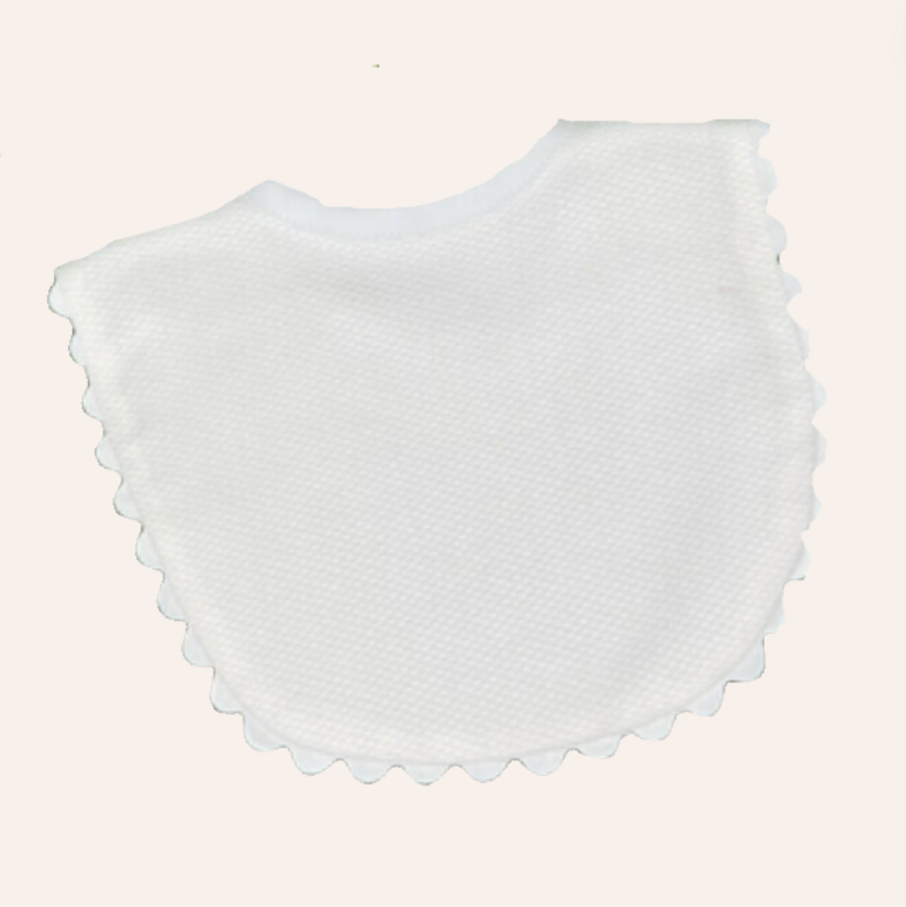 Introducing our adorable Cotton Pique Bib with Ric Rac Trim, the perfect blend of style and functionality for your little one's mealtimes. Made from high-quality cotton pique fabric, this bib is both soft against your baby's skin and easy to clean after messy meals.