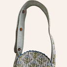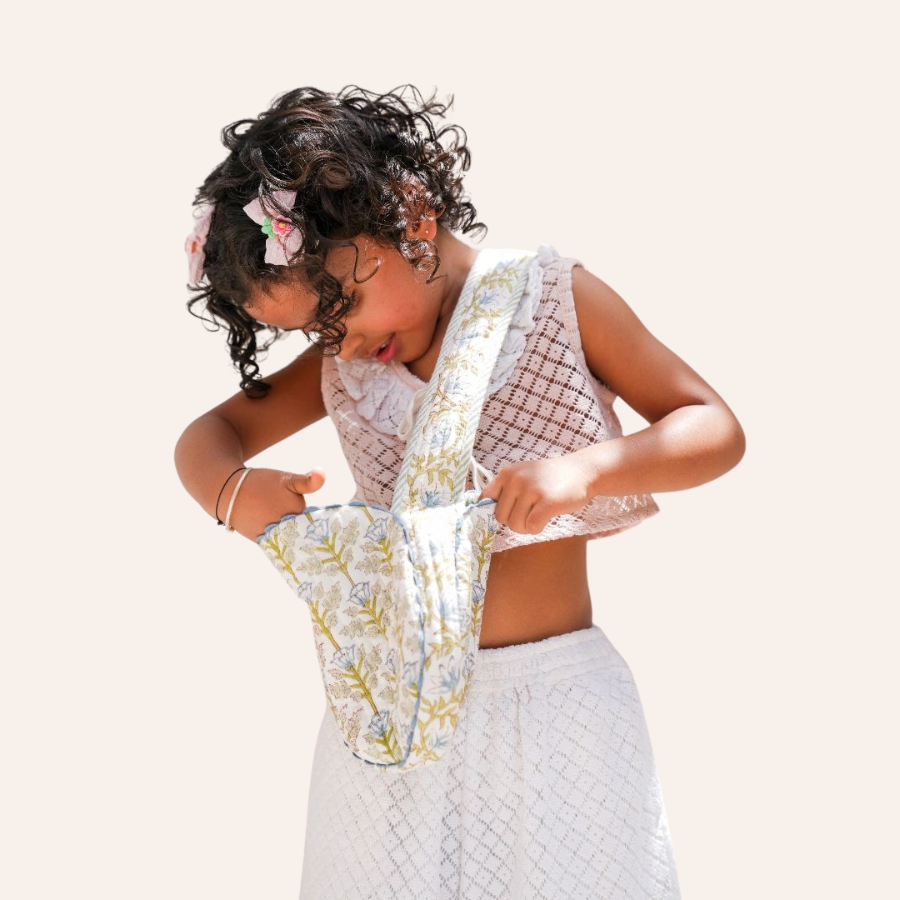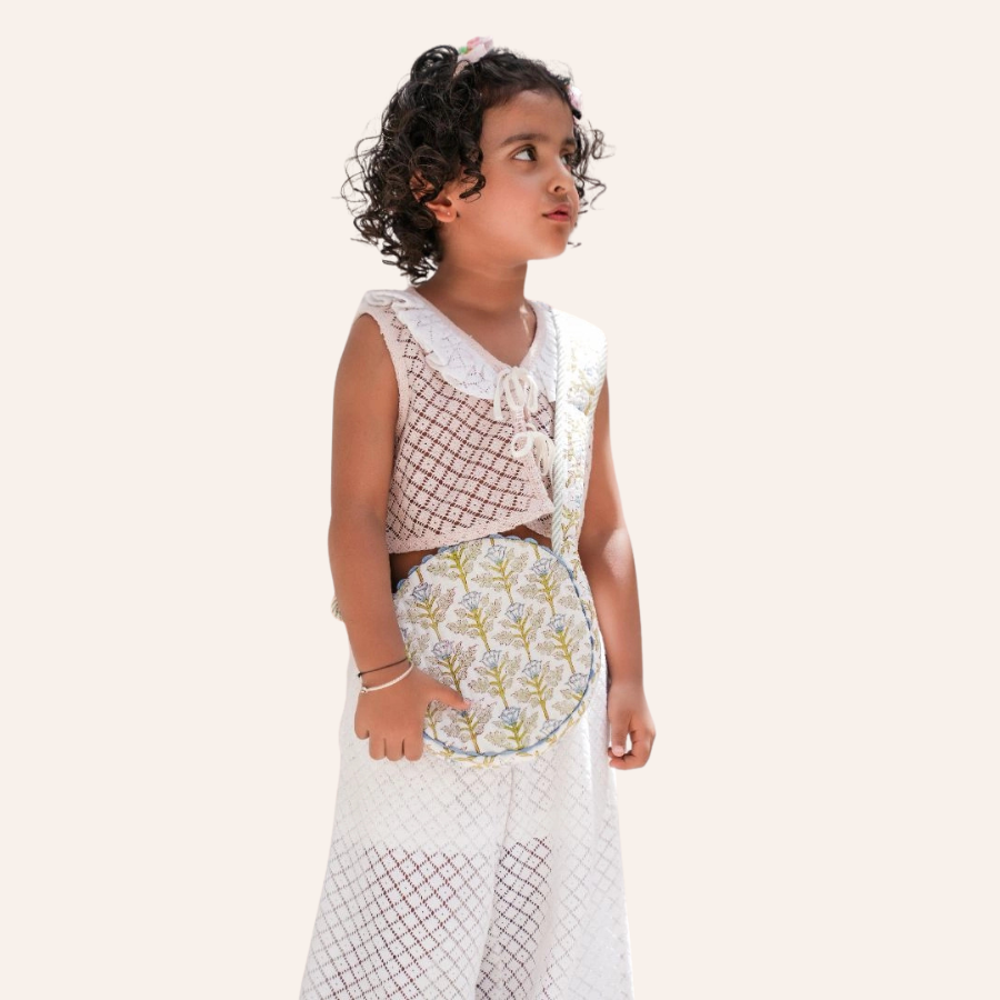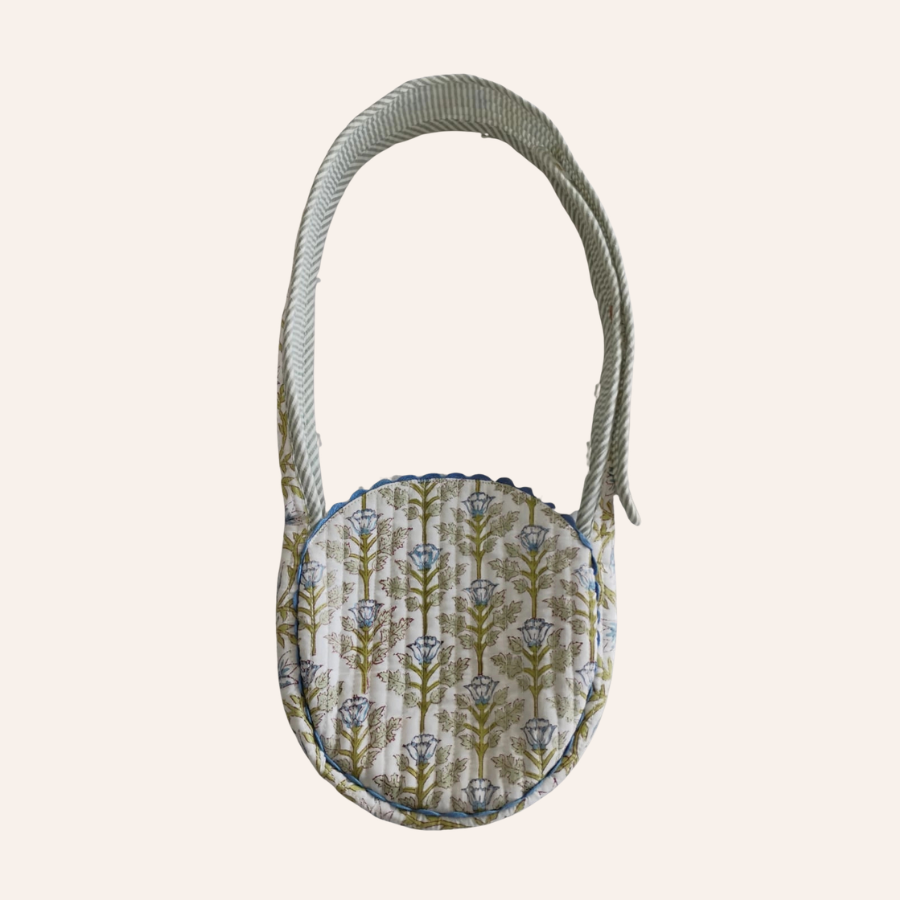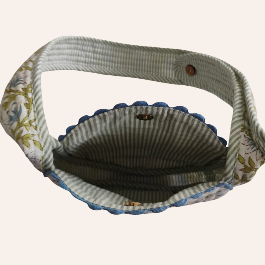 Quilted round sling bag in floral print and striped lining. Features a magnetic closure, ric-rac trim, and adjustable buttoned strap.