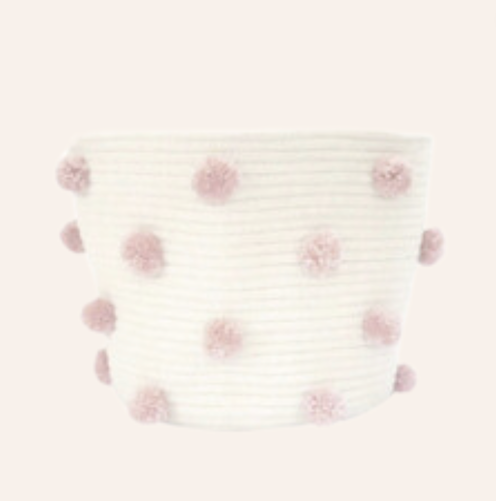 White Knitted Basket with Pink Pom Poms