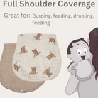 Made with 2-layers of super-soft breathable cotton, our pre-washed Burp Cloth is gentle on your baby’s delicate skin. Its small size (23" x 12") makes it the perfect multi-use burp cloth. The modern peanut-shaped design gives you full shoulder coverage great for feeding, spits-ups, burping, and drooling. It is a great baby shower gift or gift for a baby. A great addition to any baby gift basket.