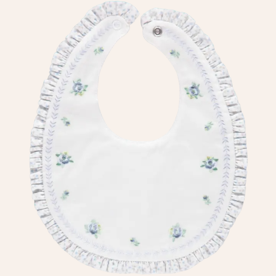 Add a touch of charm to mealtime with this delicate bib featuring floral embroidery and ruffle details. Available in white with blue or pink accents.