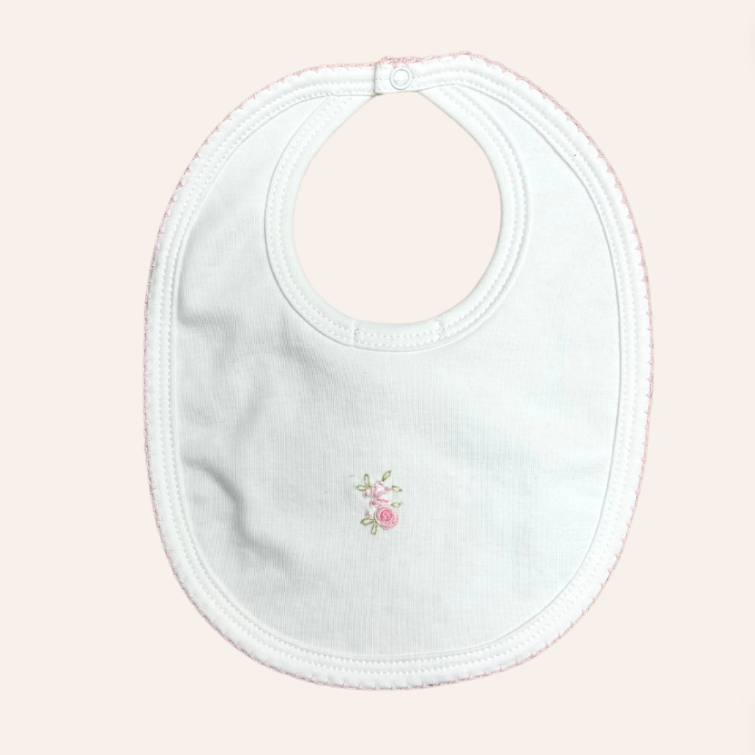Introducing our BT White Bib with Pink Picot Trim and Mini Rose, a charming and elegant accessory for your little one's mealtime! Crafted with soft and absorbent fabric, this bib offers both functionality and style.