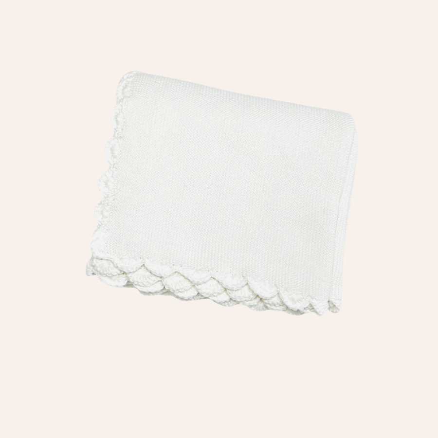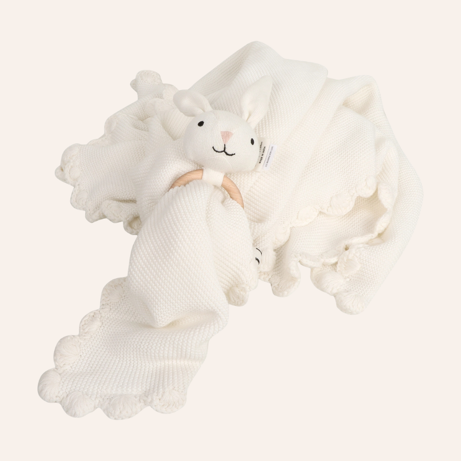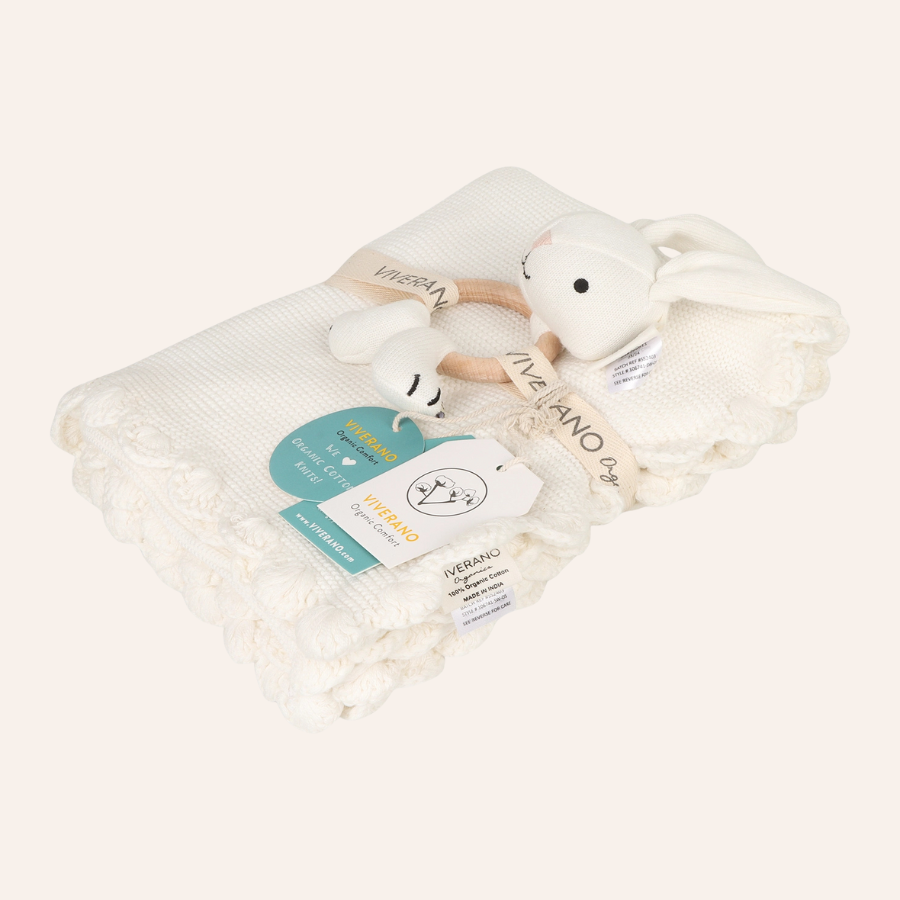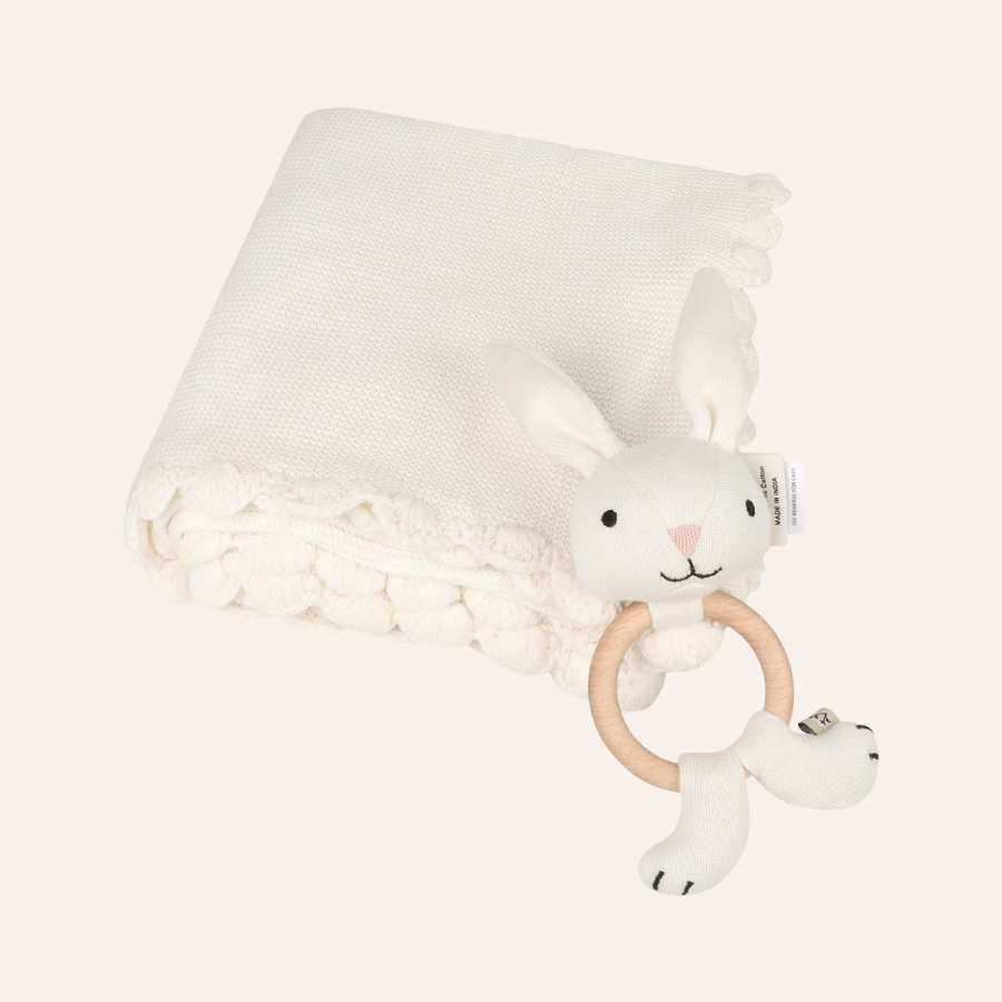Scallop Classic Knit Baby Blanket+Bunny Rattle Gift Set