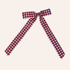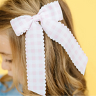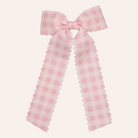Gingham long-tail bow is approximately 4 inches wide and 8 inches tall for the size medium. Grosgrain ribbon with scalloped edges. Attachement piece is an alligator clip.