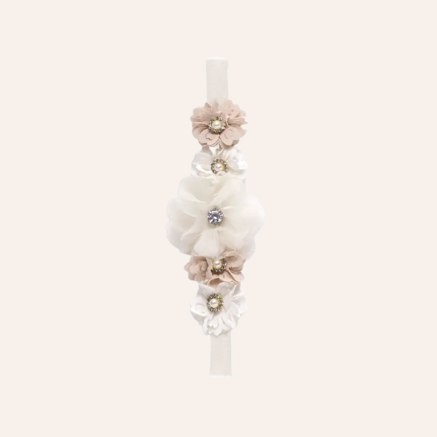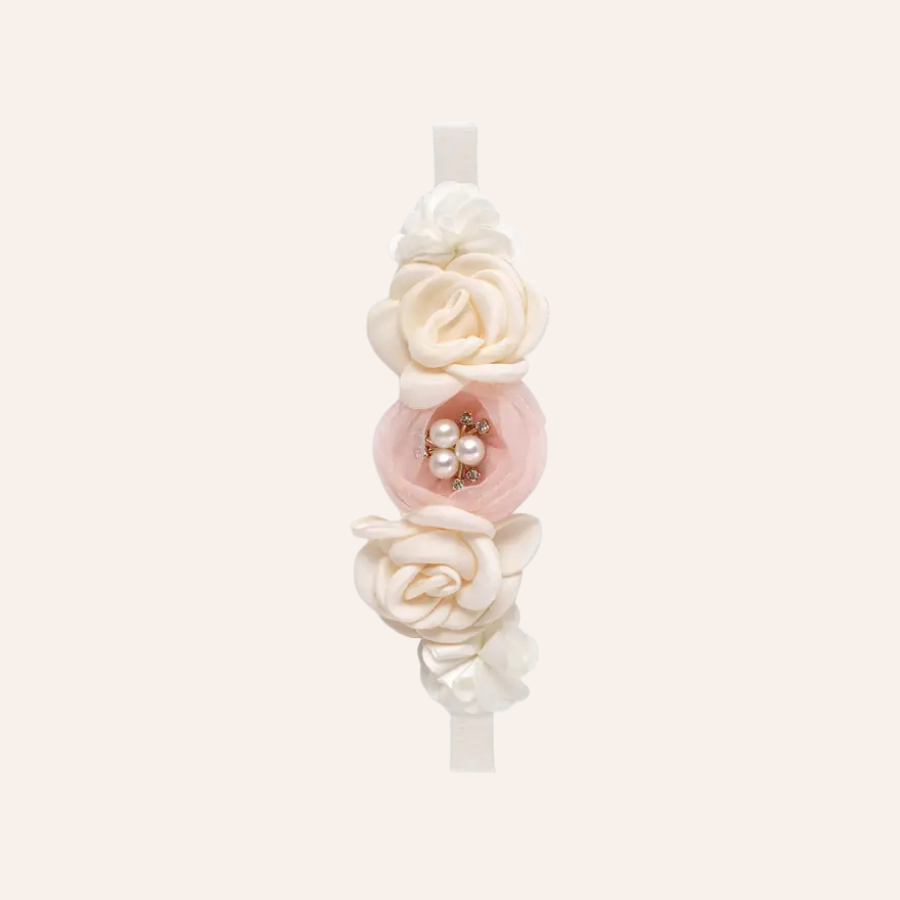 Elegant headband with faux flowers and pearls. Available in ivory, ivory/beige, and ivory/pink.
