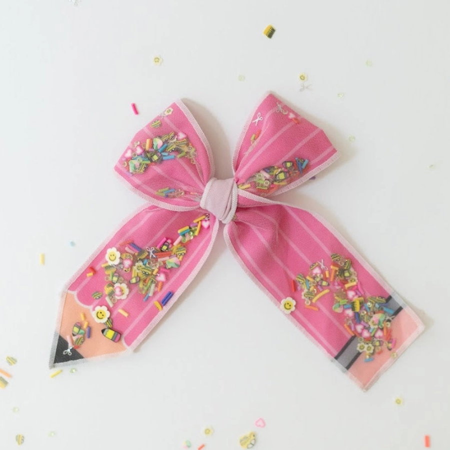 Shake up your style with our Shaker Hair Bow Let's Learn! This playful accessory adds a bouncy, eye-catching element to any hairstyle. Watch as the colorful pencil-shaped charm dances with your every move, bringing fun and flair to school days, parties, or just because. Perfect for learning enthusiasts and fashion-forward kids alike!