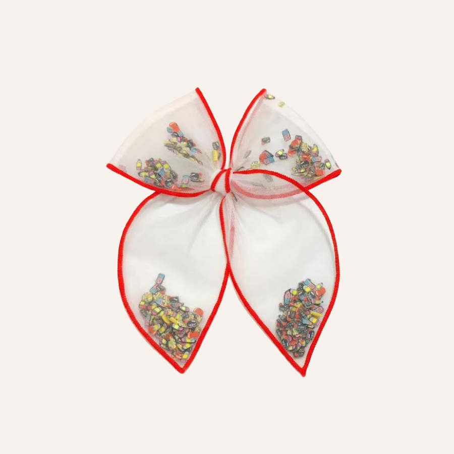 Shake up your school day with our Mesh Shaker Hair Bow! This unique bow features a playful mix of school-themed confetti that will add some fun to your hair game. Perfect for any school-loving fashionista. (Note: May cause extreme hair shaking and increased school spirit.)