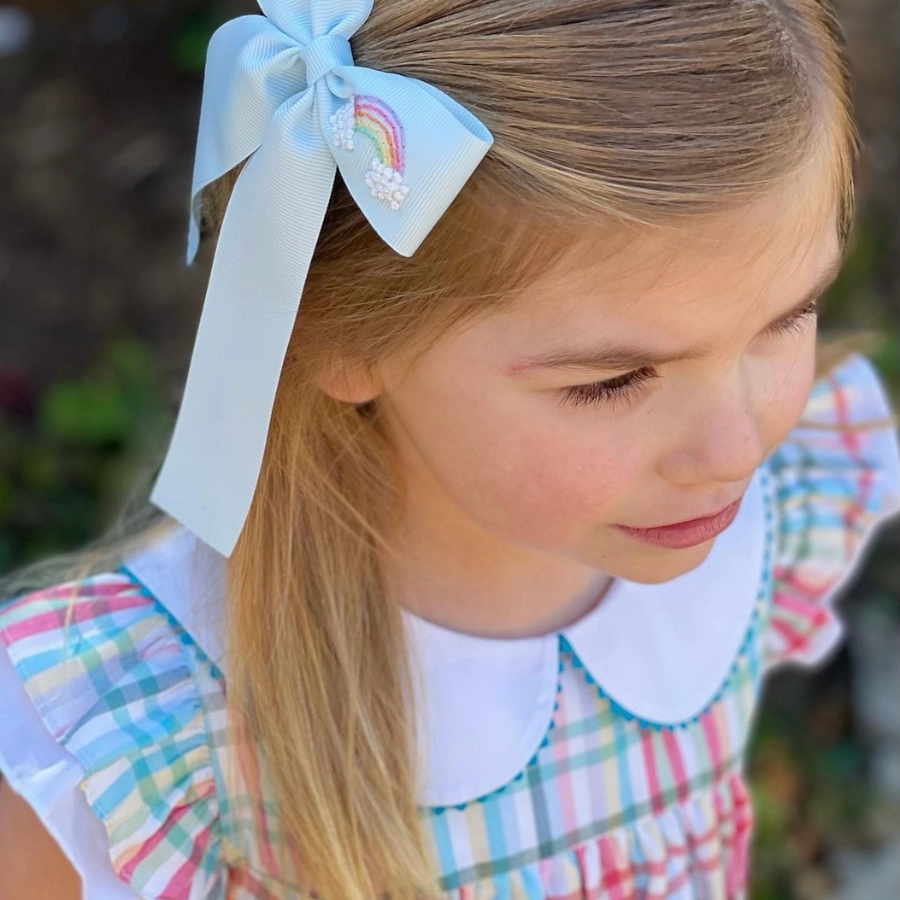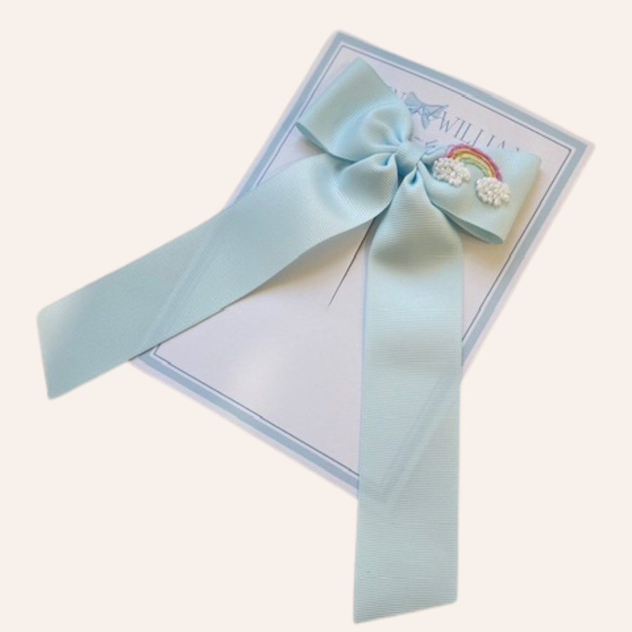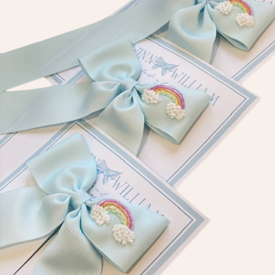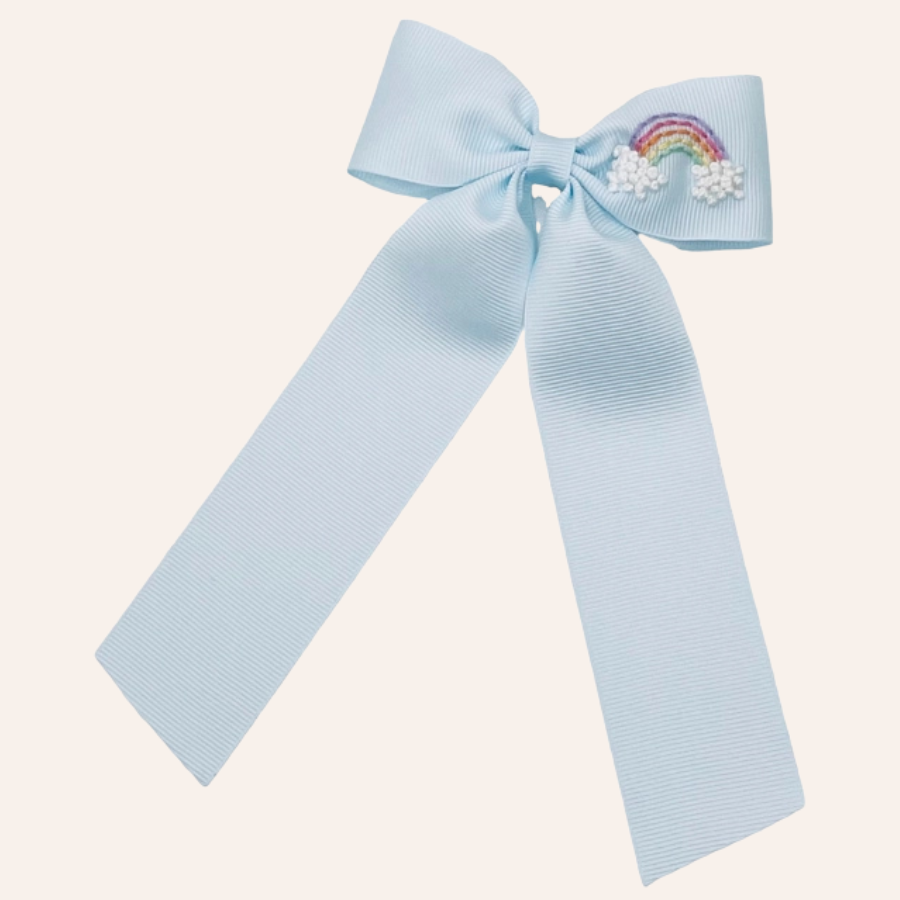 The perfect everyday bow! Available in small, medium, and large. Hand embroidered in back-stitch with french knots as clouds. The clouds are white on the colorful ribbon and pale blue on white ribbon.