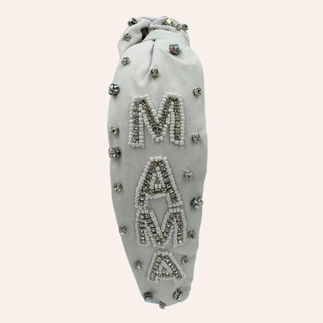 Our beaded tweed and Mama headbands are perfect for adding some preppiness to any outfit. WIDTH: 6.5" HEIGHT: 2.5"