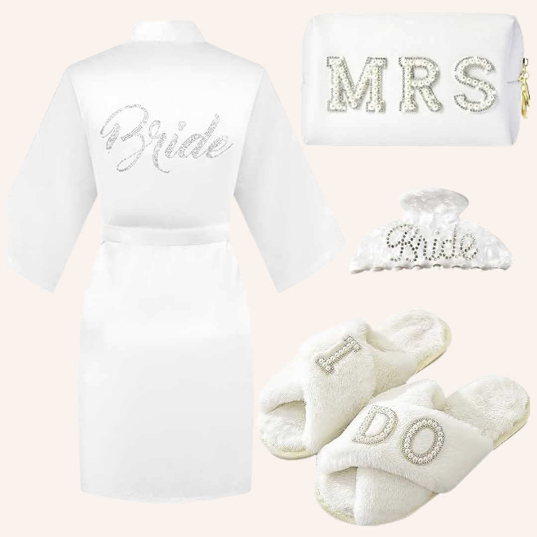 Feel pampered and stylish with this all-in-one Bride Robe Set! The one-size-fits-all silky robe, cozy slippers, sparkling hair clip, and "Bride" pouch make it the perfect set for getting ready on your big day or for your bridal shower.