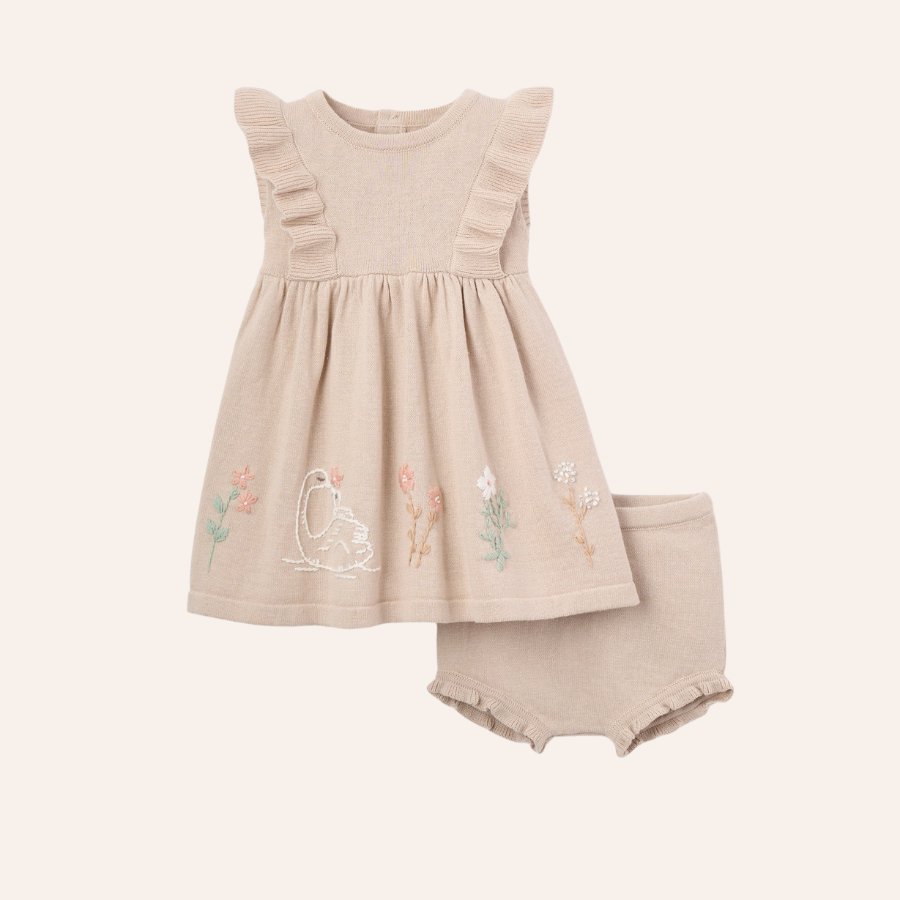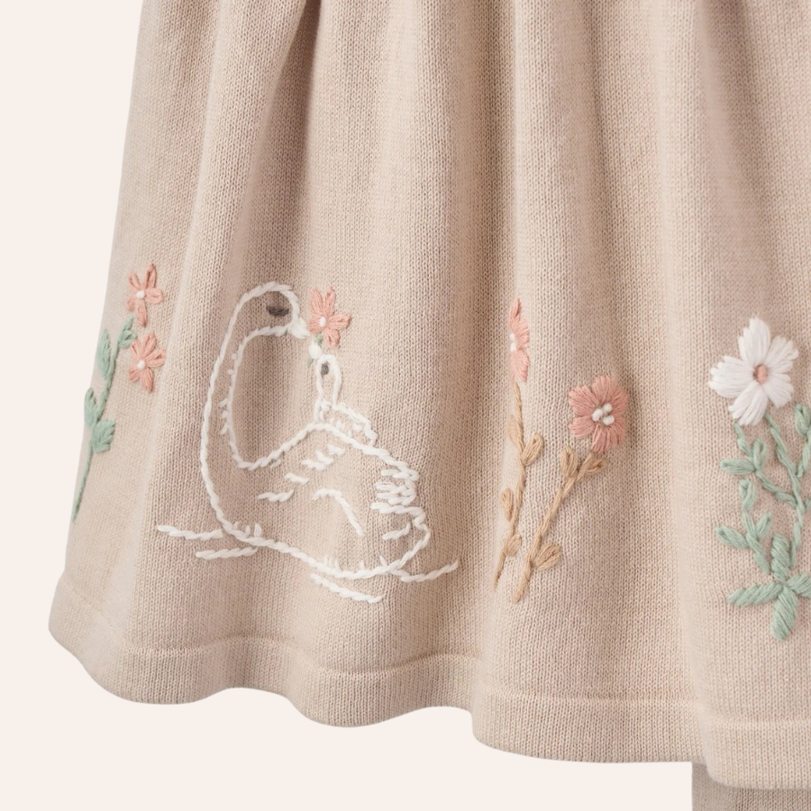 Delicate flower and swan motifs adorn this fine cotton dress, bringing a touch of storybook charm. Finished with soft ruffle sleeves, it's a timeless piece for little ones to twirl through the seasons.
