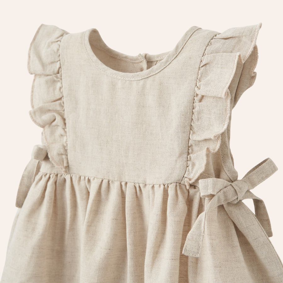 Indulge your little one in the epitome of elegance with our exquisite Beige Linen Baby Dress. Crafted with meticulous attention to detail and imbued with classic charm, this dress embodies sophistication and grace, making it a cherished addition to any baby girl's wardrobe.