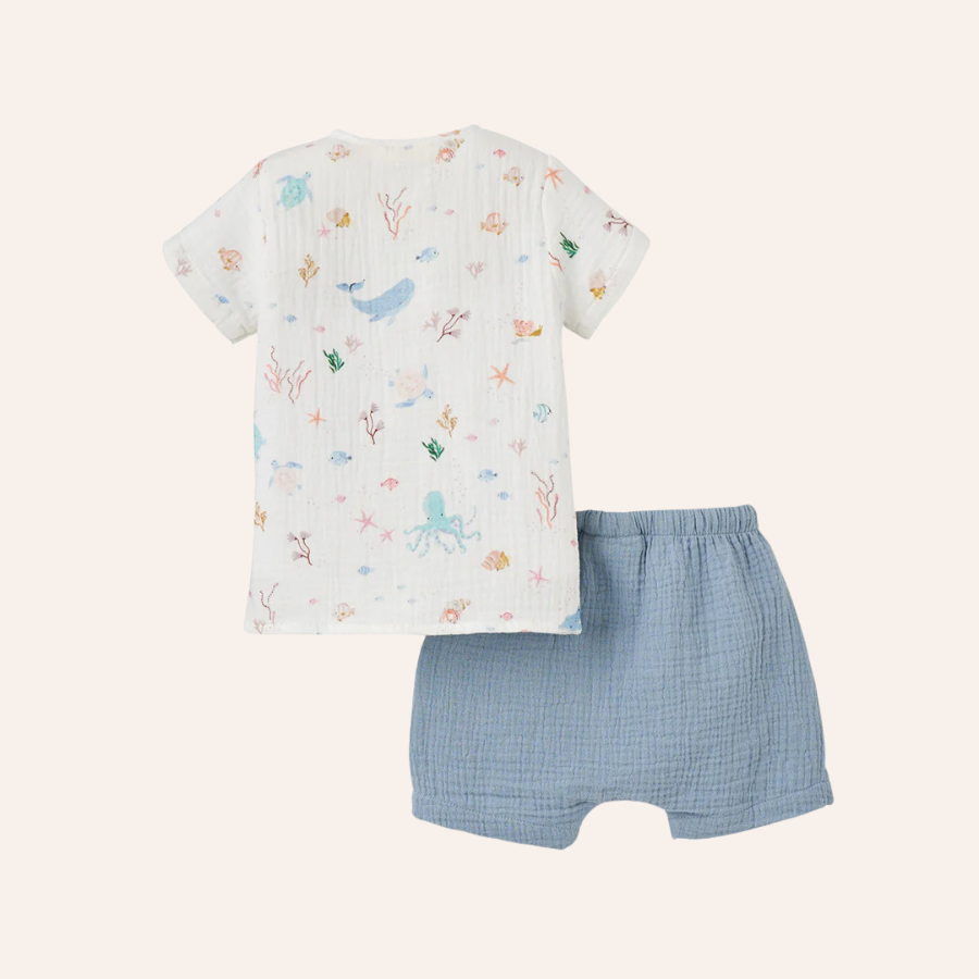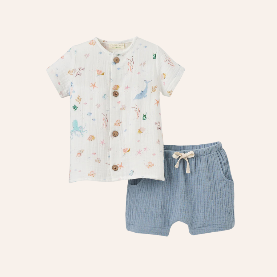 Good for baby, good for the environment. Our organic, naturally sustainable muslin is soft and breathable, ideal for outdoor adventures during the spring and summertime. Cast in a dreamy palette, this muslin tee + short set combines fashion and function for the modern child. Wooden buttons add an extra dash of style to this already stunning organic baby set.