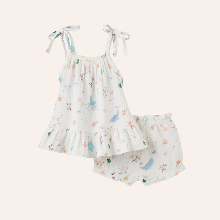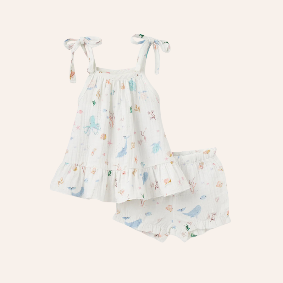 Good for baby, good for the environment. Our organic, naturally sustainable muslin is soft and breathable, ideal for outdoor adventures during the spring and summertime. Cast in a dreamy palette, this muslin tie top dress set combines fashion and function for the modern child.