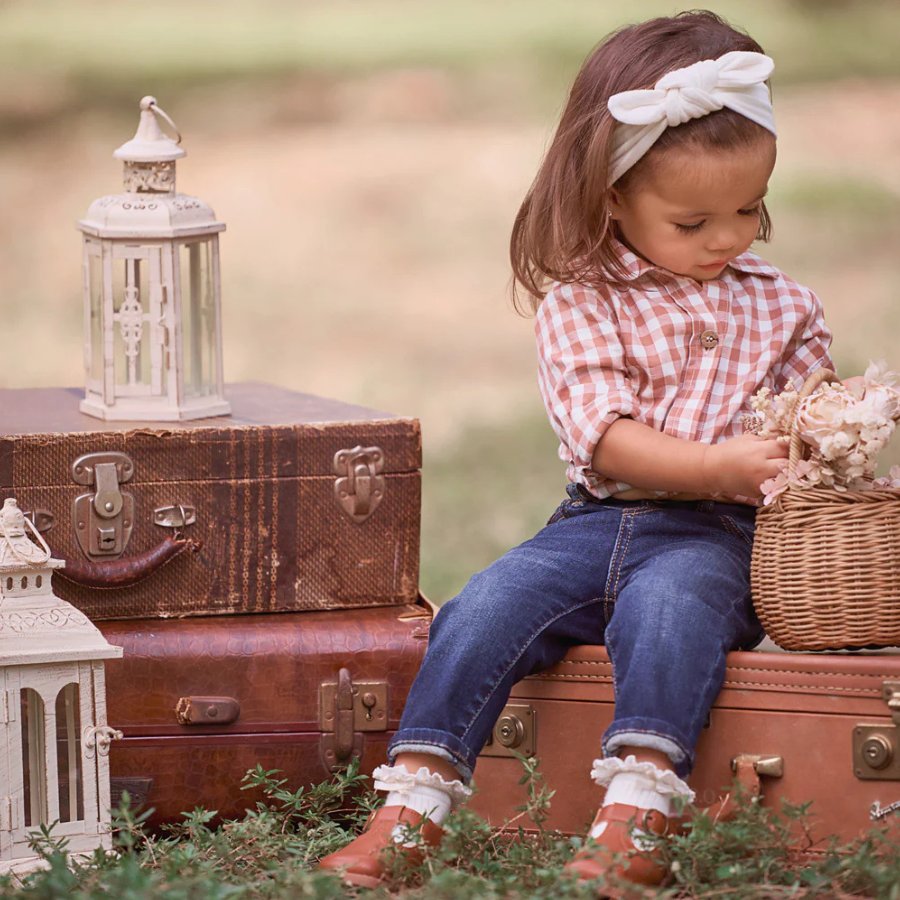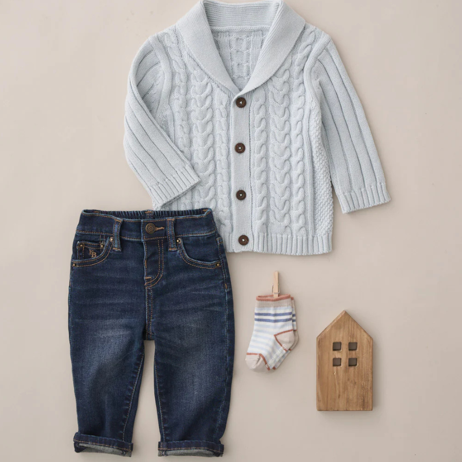 There's something oh so cute about tiny baby jeans. Made of durable yet buttery soft denim for baby and presented in a beautiful gift box, My First Jeans are sure to be the ultimate keep sake no matter the gender. Complete the look with our classic horseshoe cable cardigans and a matching pair of socks