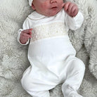 This pristine white footed jumpsuit is elegantly designed with delicate beige picot edging on the long sleeves and Peter Pan collar. The charming handmade smocking features gender-neutral beige accents, making it a perfect, thoughtful present for any baby.