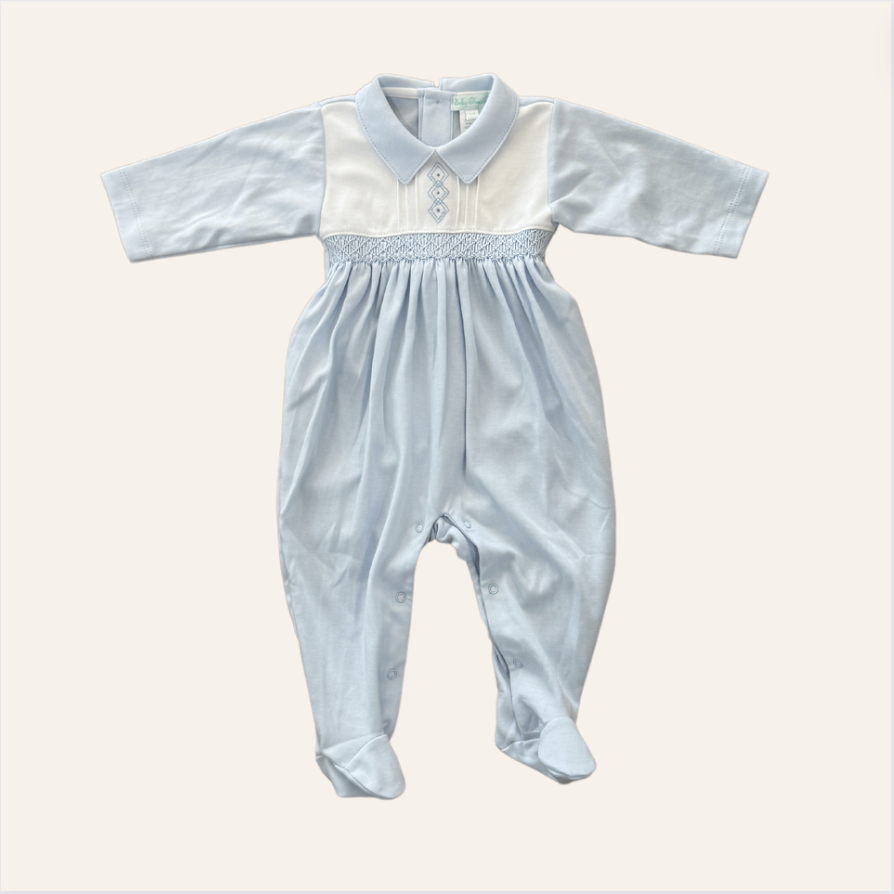BT Blue Smocked Footie with Collar and Diamond Embroidery