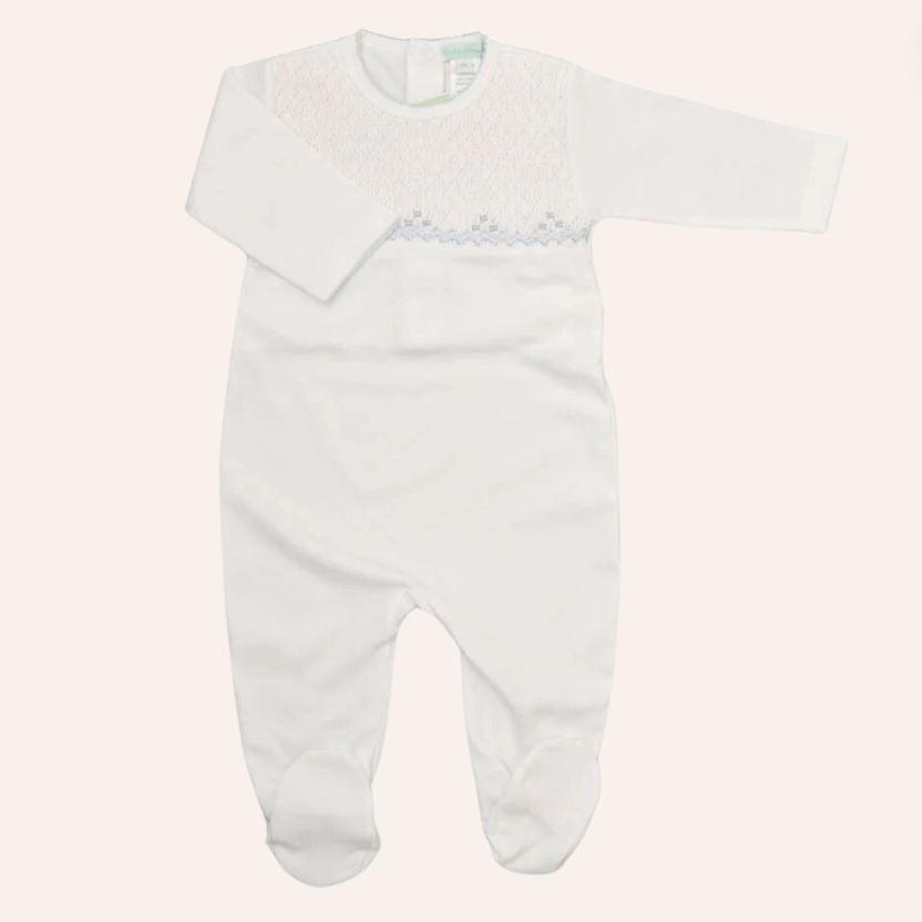Introducing our charming White and Blue Ecru Smocked Chest Footie, designed to keep your little one snug and stylish. Crafted with the utmost care and attention to detail, this adorable footie combines comfort with timeless elegance.